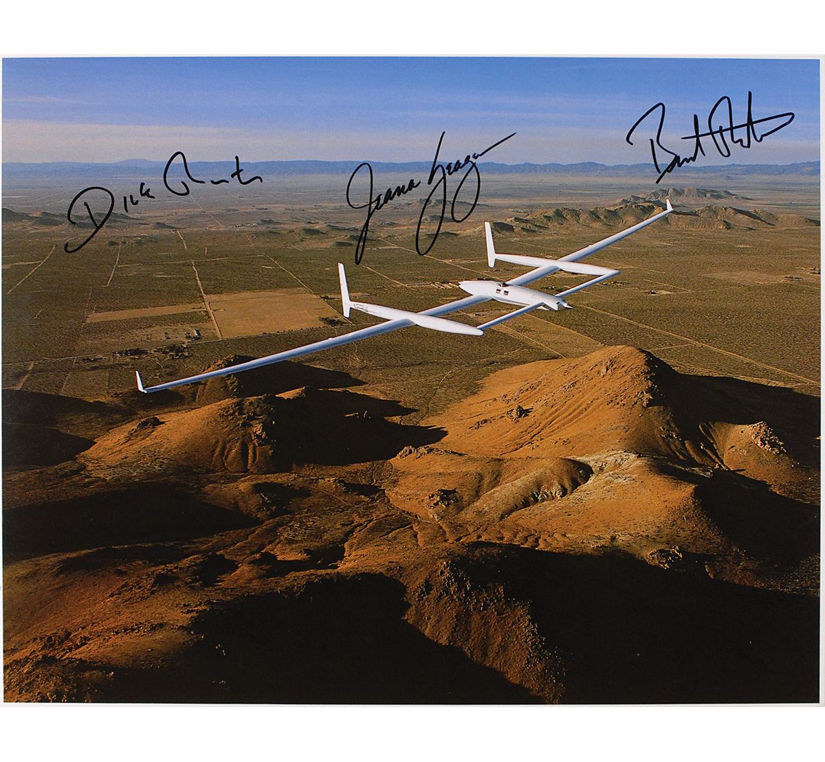 Majestic color glossy 20 x 16 double-weight photo of the Voyager in flight, signed in black felt tip by Jeana Yeager and Dick and Burt Rutan. Scattered light surface impressions and dings, otherwise fine condition.