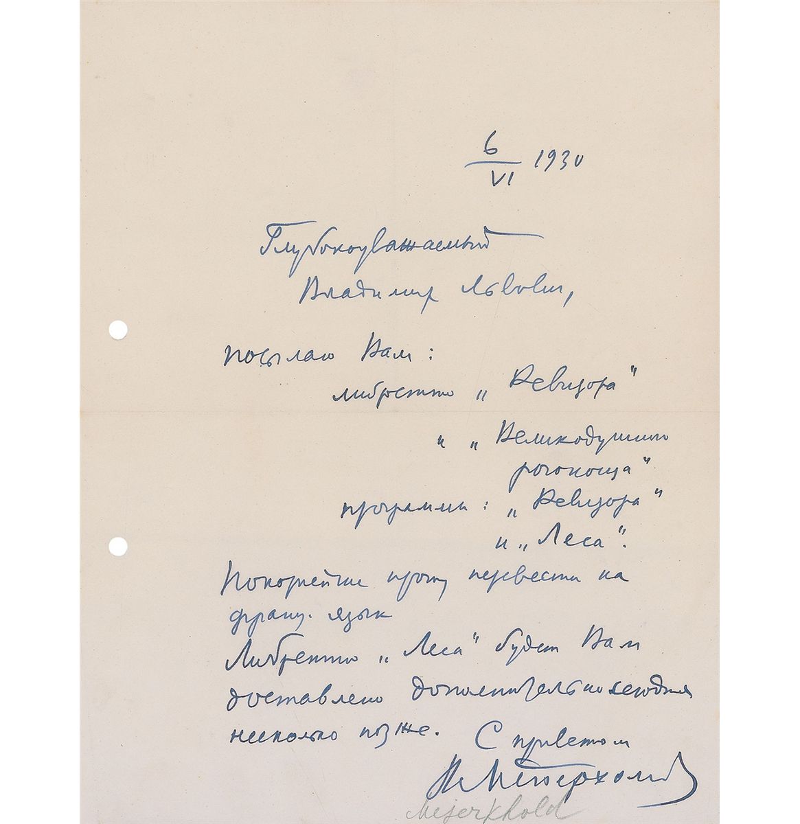 Russian theatre director and actor (1874–1940) known for his experimental works and the creation of a new acting system called biomechanics; he was executed for treason after a forced confession. Very rare ALS in Cyrillic, one page, 8.25 x 10.5, June 6, 1930. Untranslated letter to Russian writer Vladimir Bienstoch in Paris. In fine condition, with intersecting folds and filing holes to the left edge. One of the most important Russian theater directors since Stanislavsky, anything from Meyerhold is incredibly difficult to find and highly sought-after: this is the first we have ever offered.