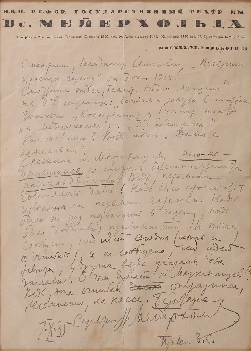Russian theatre director and actor (1874–1940) known for his experimental works and the creation of a new acting system called biomechanics; he was executed for treason after a forced confession. Scarce ALS in Cyrillic, signed “Meyerhold,” one page, 7.25 x 10, October 7, 1935. Angry letter regarding a mistake in an advertisement. In full (translated): "Look, Vladimir Semenovich, in 'Evening Red Newspaper' dated 7 October 1935. Look in the section 'Theater. Radio. Lectures' on page 4: 'Today and Tomorrow in the Theaters.' Read 'Conservatory' (on the page of Meyerhold Theater): '33 Swoons.' How could it be? After all, we play 'The Lady of the Camellias.'