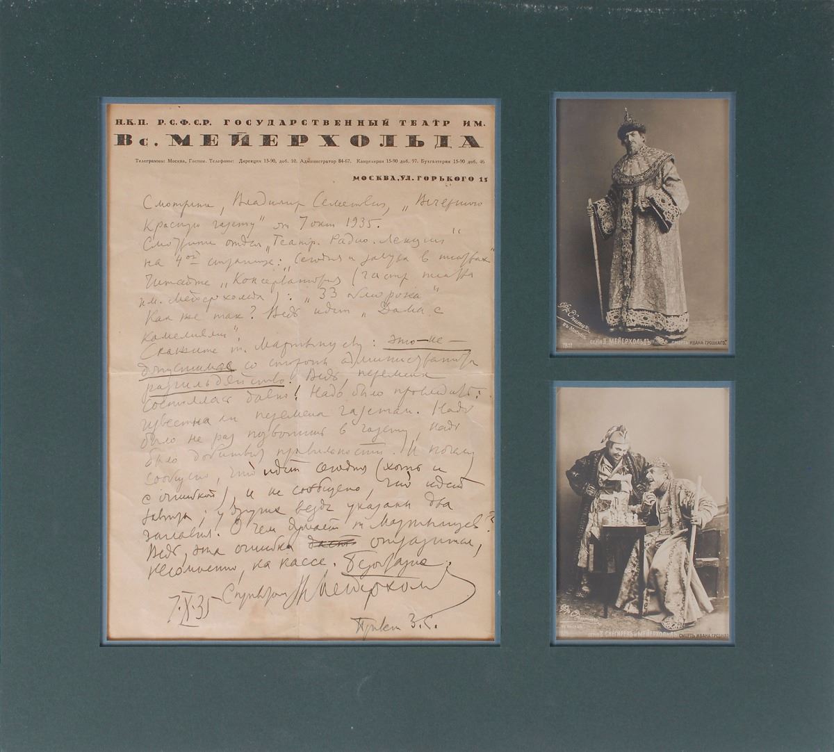 Tell Comrade Martyntsev: this is not acceptable disorderliness on the part of administrator. After all, the premiere was long time ago! It was necessary to make sure: the newspapers are aware about the change. It was necessary to call to newspaper more than once, it was necessary to insist on correctness. And why it is reported that it plays today (even with a mistake), and not reported that it plays tomorrow; all other have two titles included. What is Comrade Martyntsev thinking about? After all, this mistake will be reflected without doubt on the cash receipts. It’s outrageous!” Double-matted with two photo postcards. In very good to fine condition, with scattered overall creasing and light stains to bottom. It seems that the newspaper listing said that the production at Meyerhold’s theatre would be 33 Swoons—a compilation of three Chekhov plays—rather than The Lady of the Camellias, which is considered by many to be his greatest work. This letter reveals one of the elements of Meyerhold’s personality—strict perfectionism—that enabled him to become a seminal force in modern theatre.
