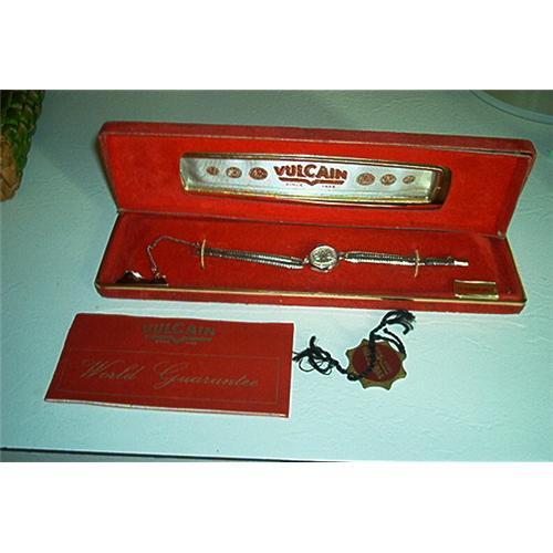 Today's auction brings to you a beautiful, white 14kt Gold VULCAIN Watch. Direction booklet and red velvet case is included.Made in La Chaux-de fonds, Switzerland. This watch should be handled with care. Maintenance tips: wind up the watch everyday at the same time, perferably in the morning. See that it does not come into contact with dust or dampness.All service should only be done by an experienced watchmaker. It is wise to give this watch, after 2-3 years of use, to a good watchmaker, as the movement should be cleaned and oiled periodically. This white gold Vulcain watch also contains a white gold safety chain. Length of the watch measures 6 1/2 inches. Beautiful Vulcain Watch in Red Velvet Case.