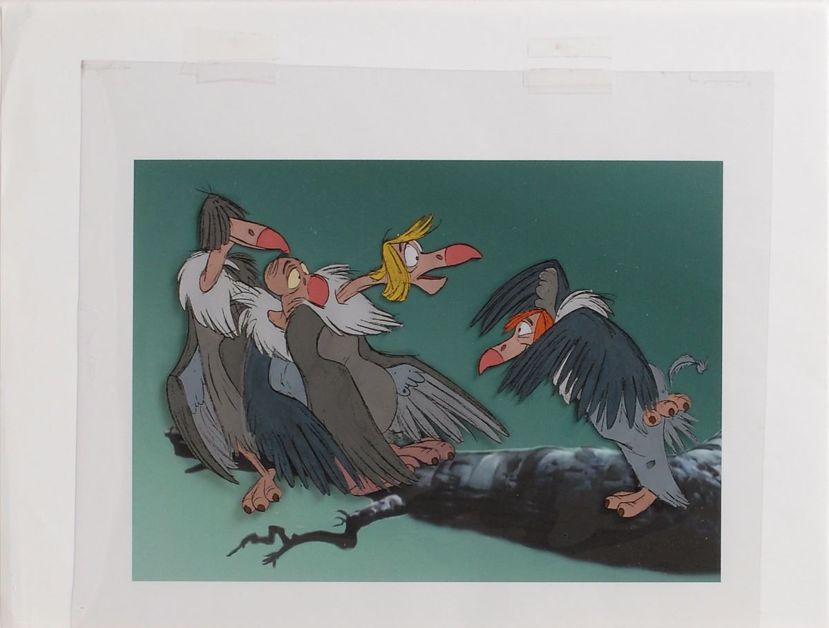 (Walt Disney Studios, 1967) Original production cel featuring the four vultures Buzzie, Flaps, Ziggy and Dizzy from The Jungle Book. The cel is placed on a color copy background. Image measures 9.25 x 5.5, with overall dimensions of 12 x 10. In fine condition, small cracks to left edge of the celluloid.