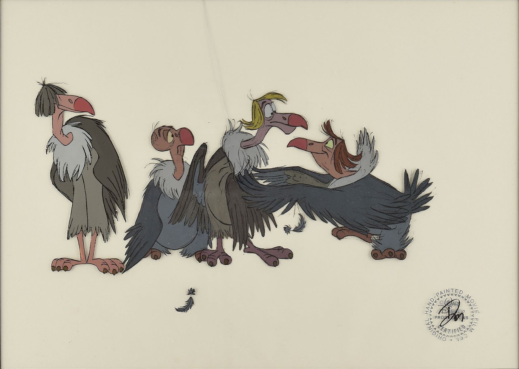 (Walt Disney Studios, 1967) Original production cel featuring the Vultures from The Jungle Book, showing the singing birds side-by-side. Total image measures 11 x 5.5, with a mat opening of 14.5 x 10.25. Archivally framed to an overall size of 21 x 17. The piece has the silver Walt Disney Company seal to lower right. In fine condition. The Jungle Book's quartet of singing vultures—Buzzie, Flaps, Ziggy, and Dizzy—were modeled after The Beatles.