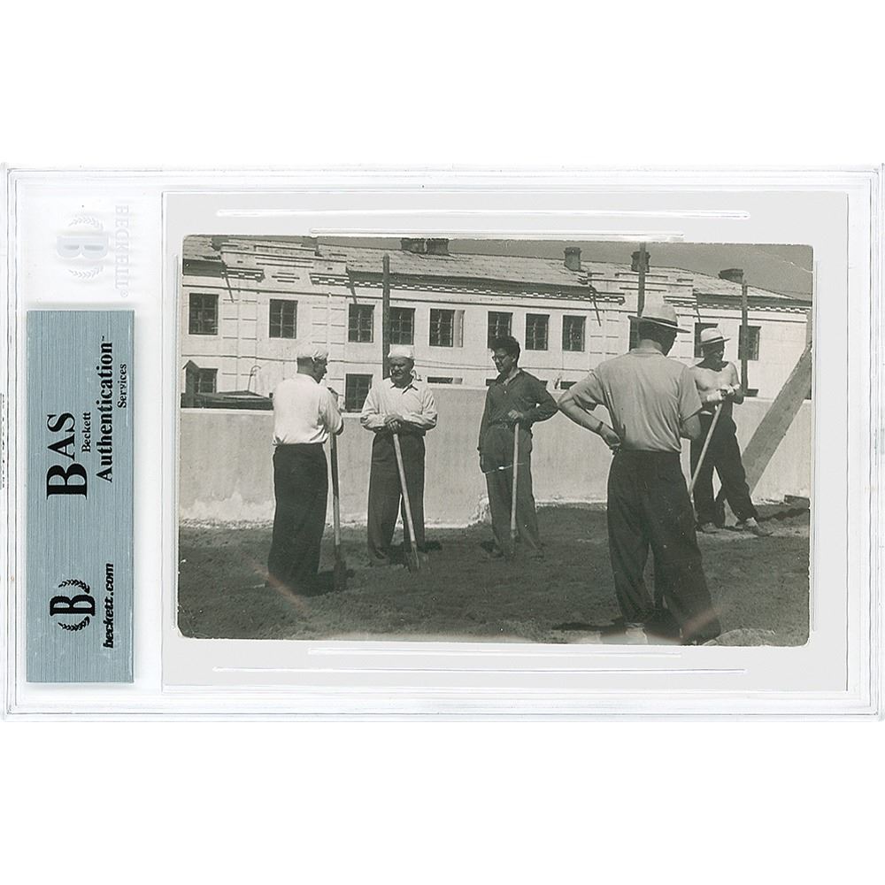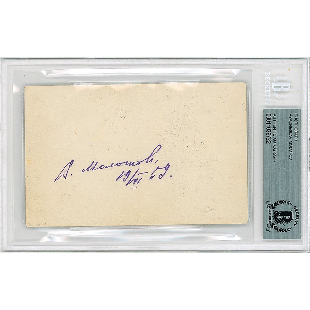 Russian statesman and prime minister (1890–1896). After World War II, he emerged as the uncompromising champion of world Sovietism. His name is preserved in the Molotov cocktail—a bottle of flammable liquid used as a weapon—which he put into production during World War II. Vintage matte-finish 5 x 3.25 photo of Vyacheslav Molotov and other men holding shovels on a work site, signed on the reverse in blue ink by Molotov, who dates the signature to 1959. In fine condition. Encapsulated in a Beckett authentication holder.