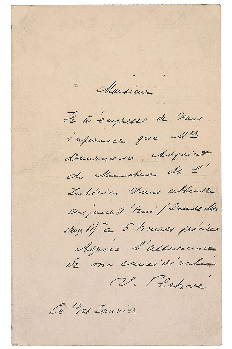 Director of Russia’s police and later Minister of the Interior (1846–1904). A notorious anti-Semite, he was killed by a bomb, the fourth attempt on his life. Uncommon ALS in French, signed “V. Plehve,” one page, 5 x 8, no date. Untranslated letter to an unidentified gentleman. In fine condition, with a bit of scattered light soiling.