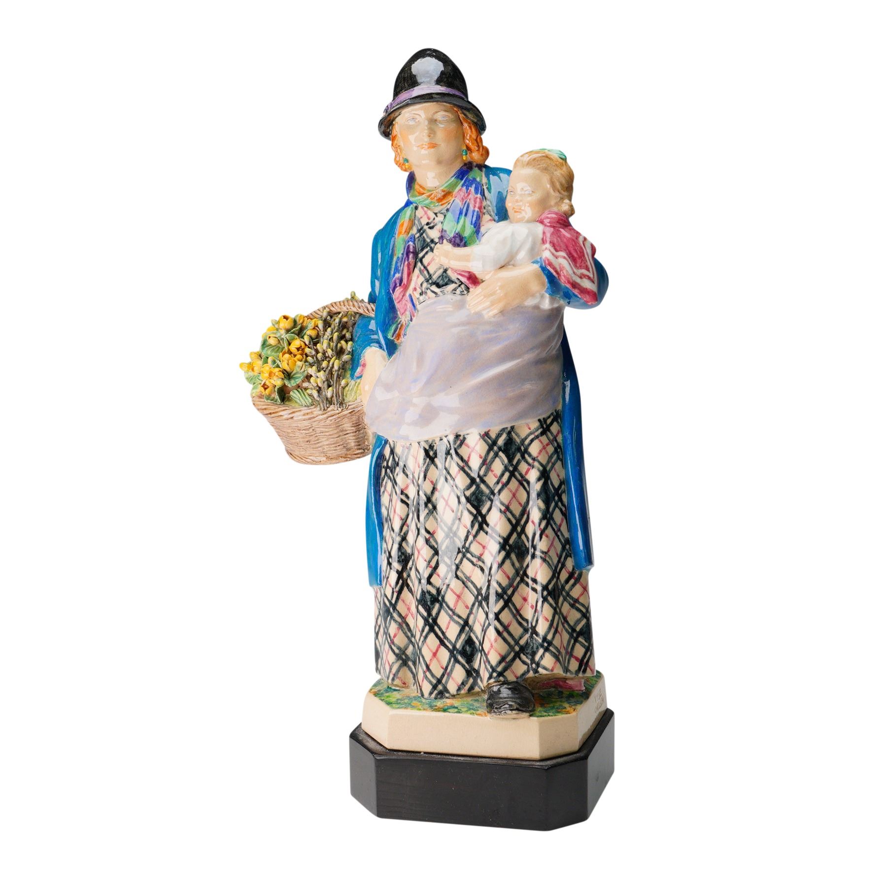 Charming hand-painted pottery figure by Vyse Chelsea depicting a flower vendor cradling a child in one arm while holding a wicker basket brimming with yellow blossoms in the other. The vendor wears a plaid skirt, blue overcoat, and black bonnet, with a vibrant scarf adding a splash of color to her ensemble. Mounted on an octagonal base with a black plinth, this expressive composition captures the daily life of a street seller with endearing realism and characterful detail. Royal Doulton backstamp. Measures 11.75"H.