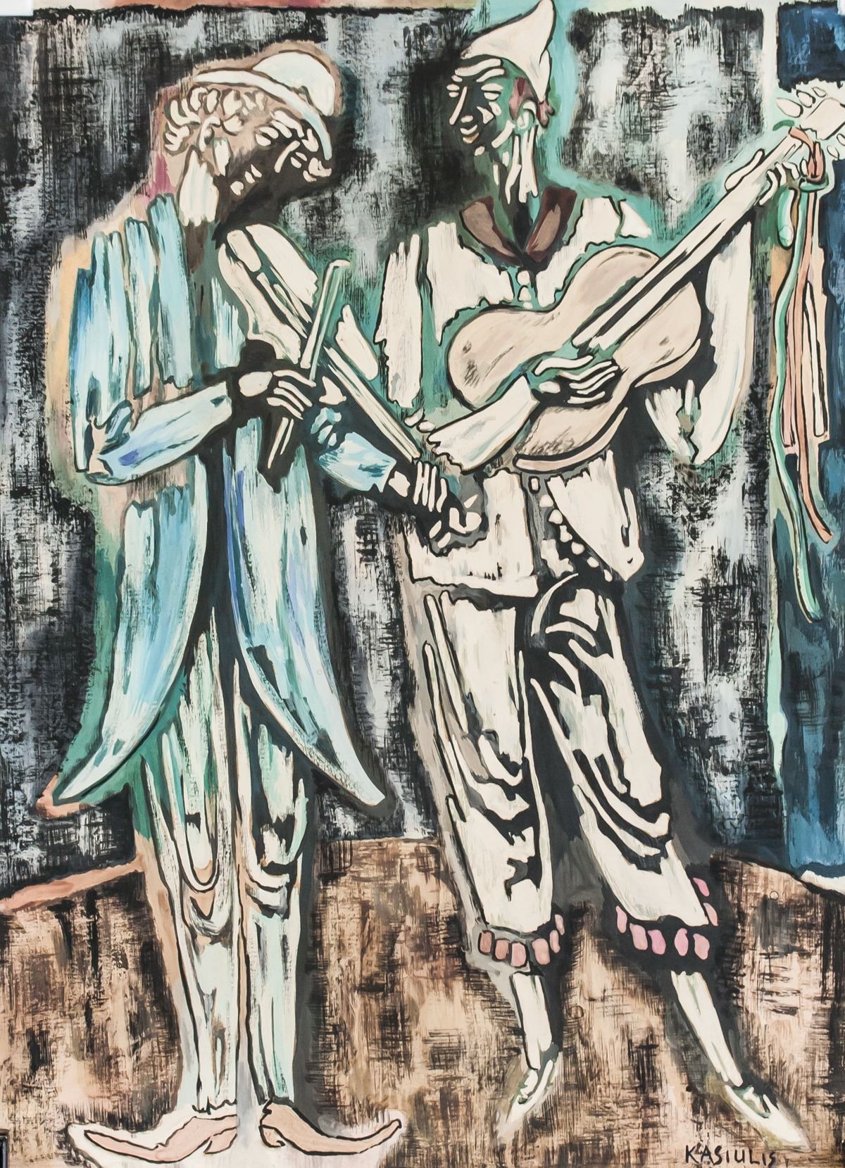 Gouache on paper. Featuring a portrait of two instrumentalists. Signed Kasiulis on the lower right corner. Attributed to Vytautas Kasiulis (1918-1995, Lithuanian). 28.5 x 21 cm (11.22 x 8.27 in). PROVENANCE: Southern Ontario estate
