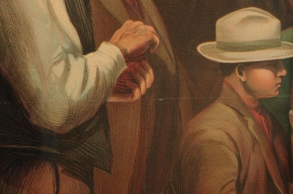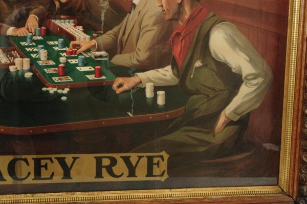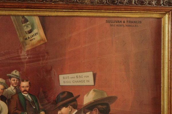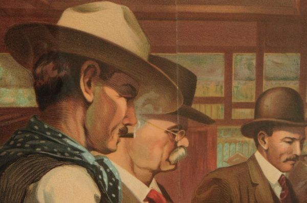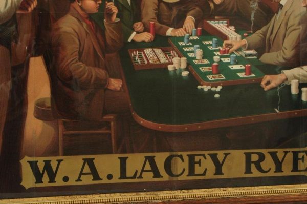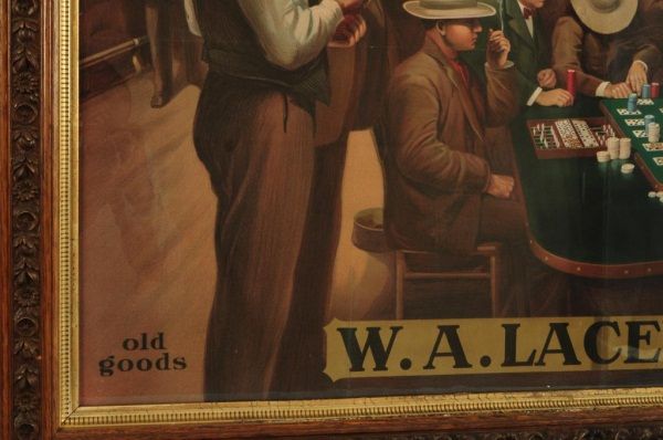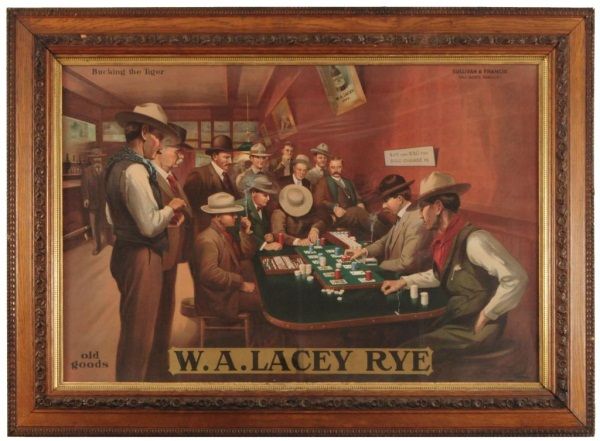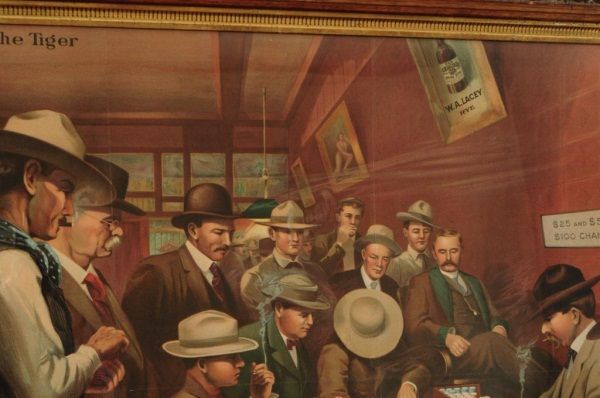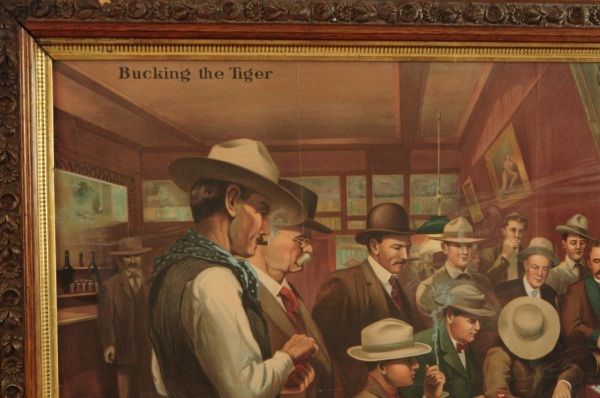 Rare chromolithograph "Bucking The Tiger" Depicting a game of Faro. Very good condtion with fold lines & creasing. Great image. Bright graphics. Image measures 40 1/2" x 27'.
