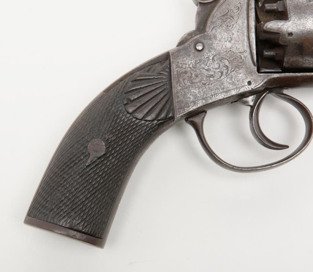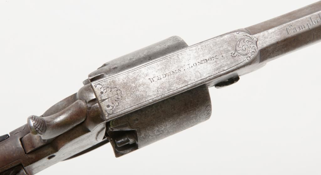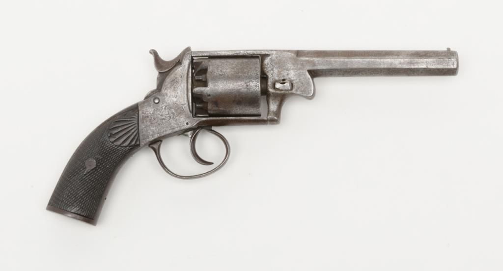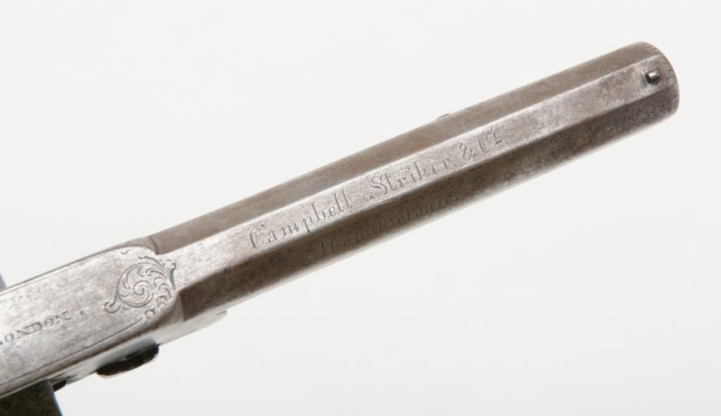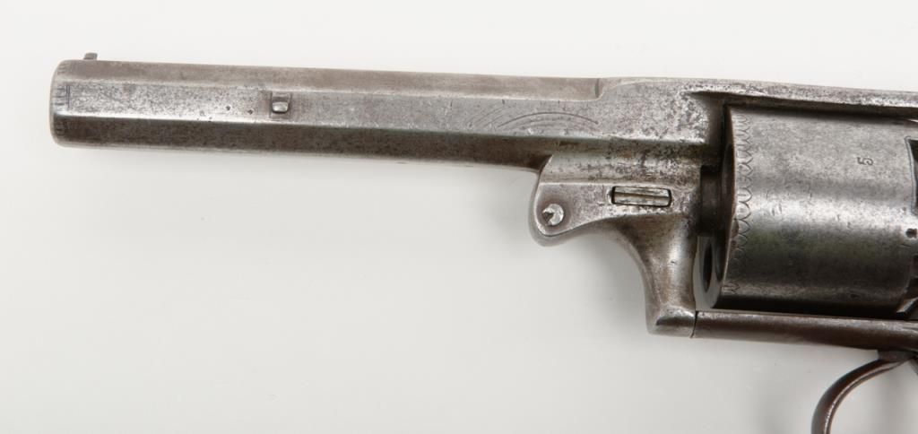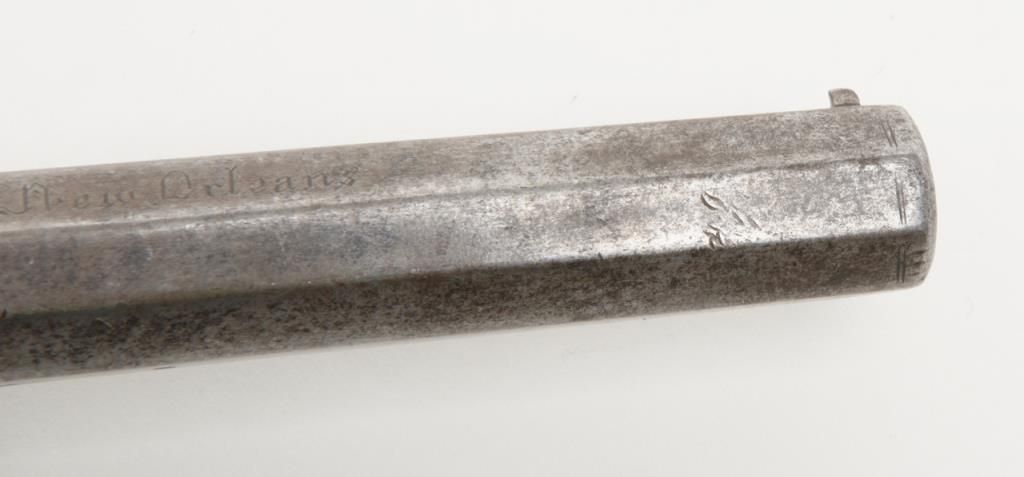 “W. Adams, London” engraved double action pinfire revolver with period engraved agent name on the barrel “Campbell, Striker & Company, New Orleans”. The pistol measures 12 ¼” overall with 5 and nearly ¾” octagon barrel with smallindistinguishable proofs to simulate British proofs and probably Continental made as an infringement. The metal surfaces show a gray to brown patina finish and the loading lever has been removed. The grips show Continental styling withcarving and shall design at the tops with checkering and a Continental style spurred escutcheon very similar in design to a Le Mat. The numbers 1 and 5 are engraved on the cylinder and it is a 5 shot. This is a very rare southern agent and the only specimen we have cataloged or ever seen. Obtained by our consignor from noted expert and author Norm Flayderman. Just the type revolver a Confederate officer would of privately purchased. Est.: $2750-$5500