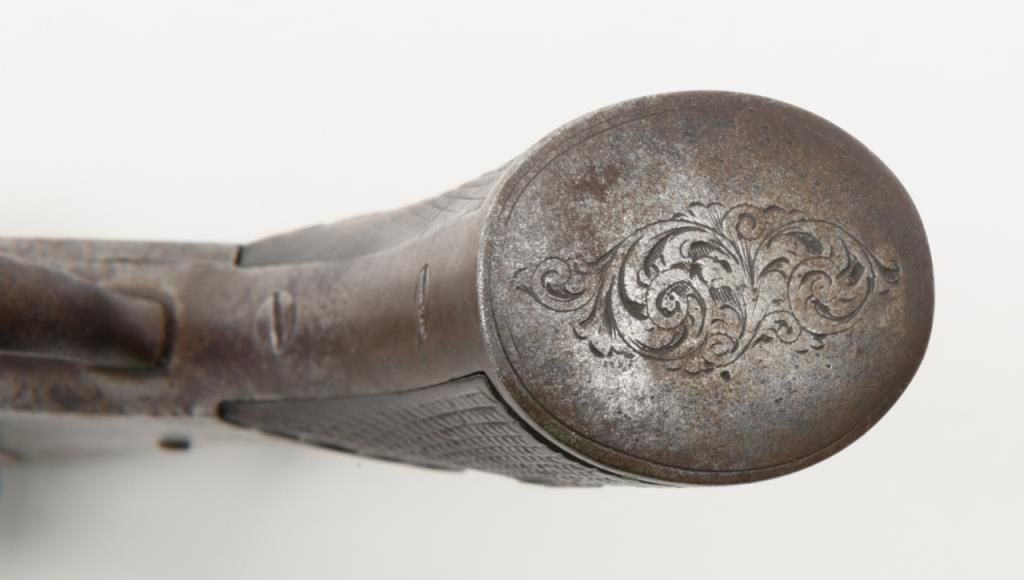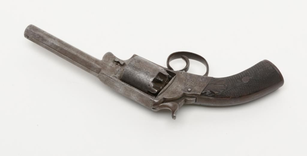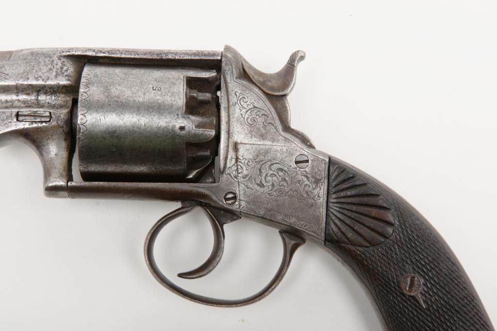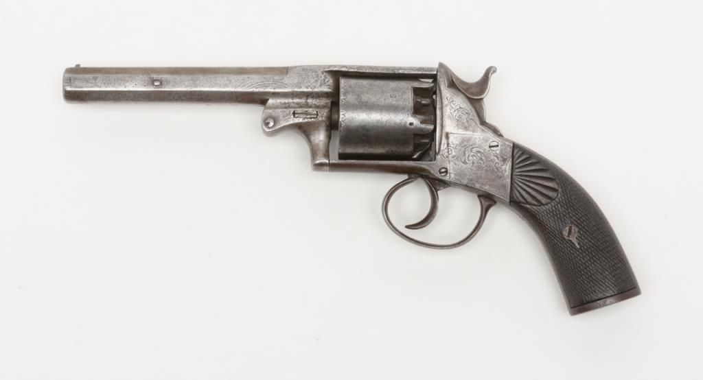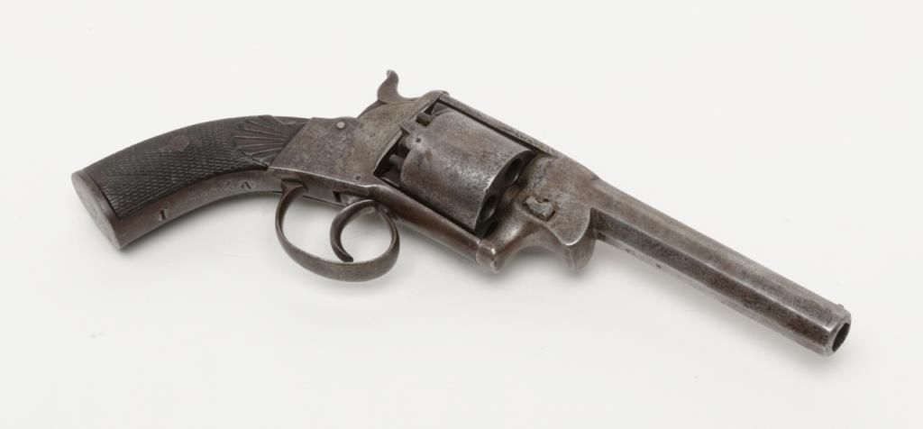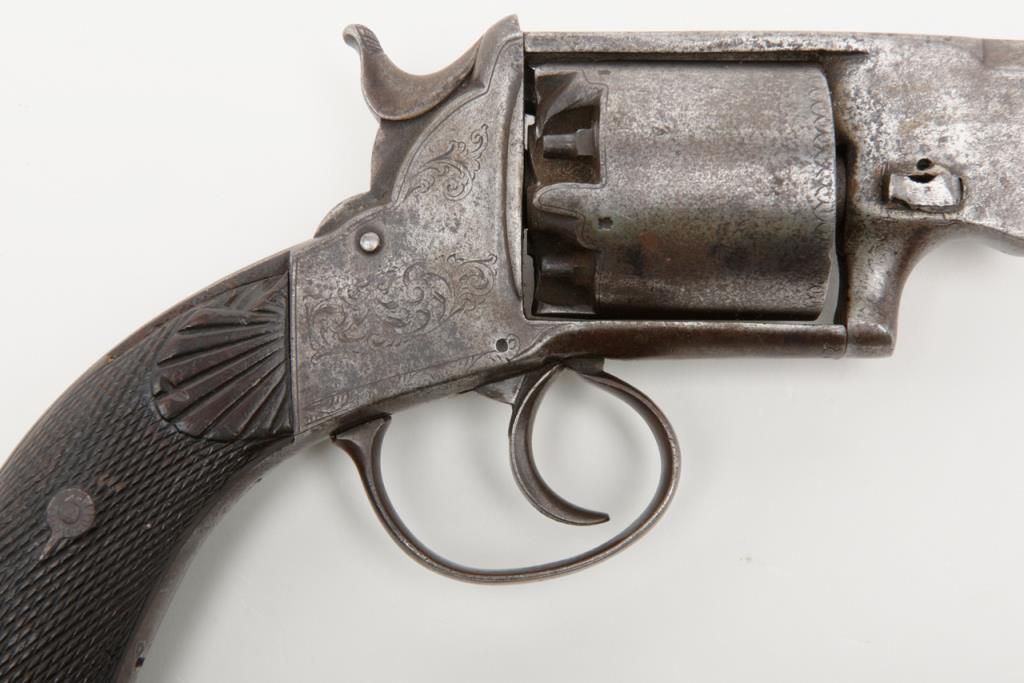 “W. Adams, London” engraved double action pinfire revolver with period engraved agent name on the barrel “Campbell, Striker & Company, New Orleans”. The pistol measures 12 ¼” overall with 5 and nearly ¾” octagon barrel with smallindistinguishable proofs to simulate British proofs and probably Continental made as an infringement. The metal surfaces show a gray to brown patina finish and the loading lever has been removed. The grips show Continental styling withcarving and shall design at the tops with checkering and a Continental style spurred escutcheon very similar in design to a Le Mat. The numbers 1 and 5 are engraved on the cylinder and it is a 5 shot. This is a very rare southern agent and the only specimen we have cataloged or ever seen. Obtained by our consignor from noted expert and author Norm Flayderman. Just the type revolver a Confederate officer would of privately purchased. Est.: $2750-$5500