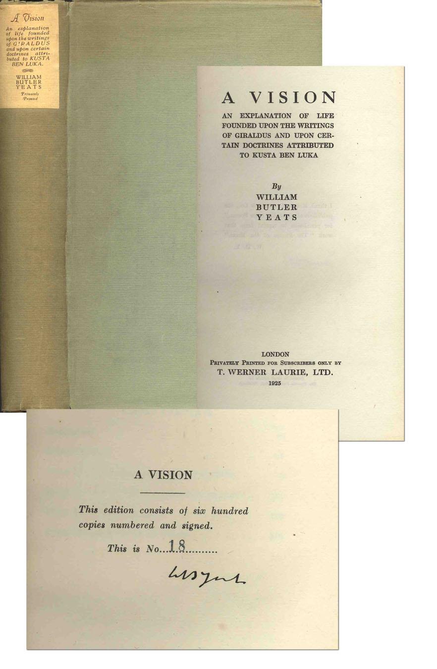 Scarce signed first edition of W.B. Yeats' esoteric work ''A Vision.'' Publisher T. Werner Laurie, LTD: London: 1925: 256pp. measuring 6'' x 9.25''. Signed on the limited edition page indicating this copy as No. 18 of the 600 published. Yeats spent an extraordinary ten years in the research and writing of this book and felt that the poetry he wrote afterwards was significantly informed by his studies for it. He writes here, ''…I wished for a system of thought that would leave my imagination free to create as it chose…'' Sage green hardcover with plain dustjacket with chipping along top spine, very slight foxing along edges of pages throughout. Very good condition.