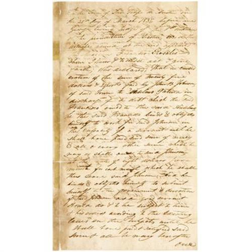 <B>W. Barret Travis Autograph Document Signed Twice</B></I> "<I>W. Barret Travis</B></I>," two pages, 7.5" x 12.5", front and verso, March 25, 1835. In full, "<I>In the Town of San Felipe de Austin on the 25th day of March 1835, before me, George Ewing Judge of the 1st instance of the jurisdiction of Austin, and the witnesses named at the end, appeared the Mexican Francisco Rosales - whom I know & to whose act I give faith; who declared: That in consideration of the sum of twenty five dollars & 25/100ths paid by John B. Johnson, of said Town to Anselmo Patina in discharge of a debt which the said Francisco owed to the said Anselmo he the said Francisco binds & obligates himself the work for said Johnson in the capacity of a servant until he shall have paid said sum of money & all every other sum which he may or shall owe to said Johnson, at the rate of eight dollars per month for each month which he shall thus serve said Johnson. And he binds & obligated himself to submit himself to the government & direction of said Johnson as a good servant should do & to be subject to him & his orders according to the existing laws on the subjects until he shall have paid & satisfied said sum & all he may hereafter owe to him at the said rate of eight dollars per month & he binds & obligates himself not to quit the service of said Johnson without his express consent & approbation, under no pretext whatever until he shall have paid with his service the said debt & all other debts that may become due; & to pay to said Johnson the ordinary rates for all clothes which he may furnish him at his request & with his approbation & consent. He renounces all laws which might favor him & signed this instrument before me - </B></I><B><I>W. Barret Travis</B></I></B></I><I> & T.L. Hill - instrumental witnesses together with those of my assistance with whom I authenticate in conformity to law- Instrumental witnesses.</B></I>" Signed "<I>W. Barret Travis</B></I>," Francisco Rosales's "<I>X</B></I>," and an illegible signature. Assistant Witnesses signing: "<I>John M. Allen</B></I>" and "<I>G. A. Powell</B></I>." Also signed: "<I>Geo. Ewing</B></I>." The document is docketed in an unknown hand on the integral leaf, "<I>Indenture/F. Rosales/to/John B. Johnson/1835</B></I>." Born near Saluda, South Carolina, the first child (of 11) of farmer Mark and Jemima Travis, William Barret Travis moved with his family to Alabama when he was nine-years-old. He attended school in Claiborne, Alabama, and eventually was accepted as an apprentice to the town's leading attorney, James Dellet. In 1828, at the age of 19, Travis married Rosanna Caro and their son, Charles, was born the following year. By the time he was 21, W. Barret Travis founded the Claiborne <I>Herald</B></I>, becoming the publisher and editor. He had accepted a position as adjutant in the Alabama Militia and opened a law office. Possibly because his newspaper was not profitable and income from his law office was not enough to pay his debts, as well as an unhappy marriage, Travis abandoned his pregnant wife (Susan was born in 1831) and son and left for Texas in April 1831. Arriving in San Felipe de Austin, he obtained land from Stephen F. Austin on May 21, 1831, listing his marital status as "single." He established a legal practice in Anahuac on Galveston Bay. Travis traveled through Texas doing legal work, becoming associated with a group of militants who opposed the Law of April 6, 1830, designed to stop the flood of immigration from the United States to Texas and to encourage Mexican and European settlement. Eventually this group became known as the "War Party" as tension increased between the Mexican government and American settlers in Texas. After the Anahuac Disturbances of 1832, Travis moved his legal practice to San Felipe de Austin. In 1834, he was elected secretary to the ayuntamiento, the principal governing body.<BR><BR>By March of 1835 a huge rift had grown between "Peace Party" and "War Party" Texans as to what course of action should be pursued regarding centralism and states' rights. Elections for governor, vice-governor, and members of the legislature had recently taken place in Coahuila and Texas. Evidence of legislative corruption appeared in a decree passed on March 14, 1835, authorizing the governor to sell 400 leagues of land, over 1.7 million acres, at less than two cents per acre, without being subject to the provisions of the general colonization law of 1825. The lands were shortly disposed of to speculators. Texas wanted to separate from Coahuila. On March 15th, Stephen F. Austin wrote "The territorial question is dead. The advocates of that measure are now strongly in favor of a state government; and that measure is now before Congress. A call has been made upon the president [Santa Anna] for information on the subject; and I am assured the president will make his communication in a few days, and that it will be decidedly in favor of Texas and the state." Santa Anna was simply delaying until he could get Texas occupied with his troops.<BR><BR>It was at this time, ten days after Austin's letter, that 25-year-old lawyer William Barret Travis accomplished this document by which the $25.25 debt of Mexican Francisco Rosales to Anselmo Patina has been paid by John B. Johnson and, in turn, Rosales agrees to be an indentured servant for Johnson at $8.00 per month until his debt was paid. <B>John B. Johnson</B></I>, later clerk of Austin County, was in charge of the commissary at San Felipe, issuing rations to companies passing through during the Texas Revolution. In 1839, <B>John M. Allen</B></I> was elected the first mayor of Galveston. He came to Texas in 1830 and joined the Tampico expedition in October 1835 but escaped imprisonment. Allen returned to Texas in December, enlisted in the revolutionary army, was appointed captain of infantry, and served as acting major at the battle of San Jacinto. The ayuntamiento of Austin had elected <B>George Ew