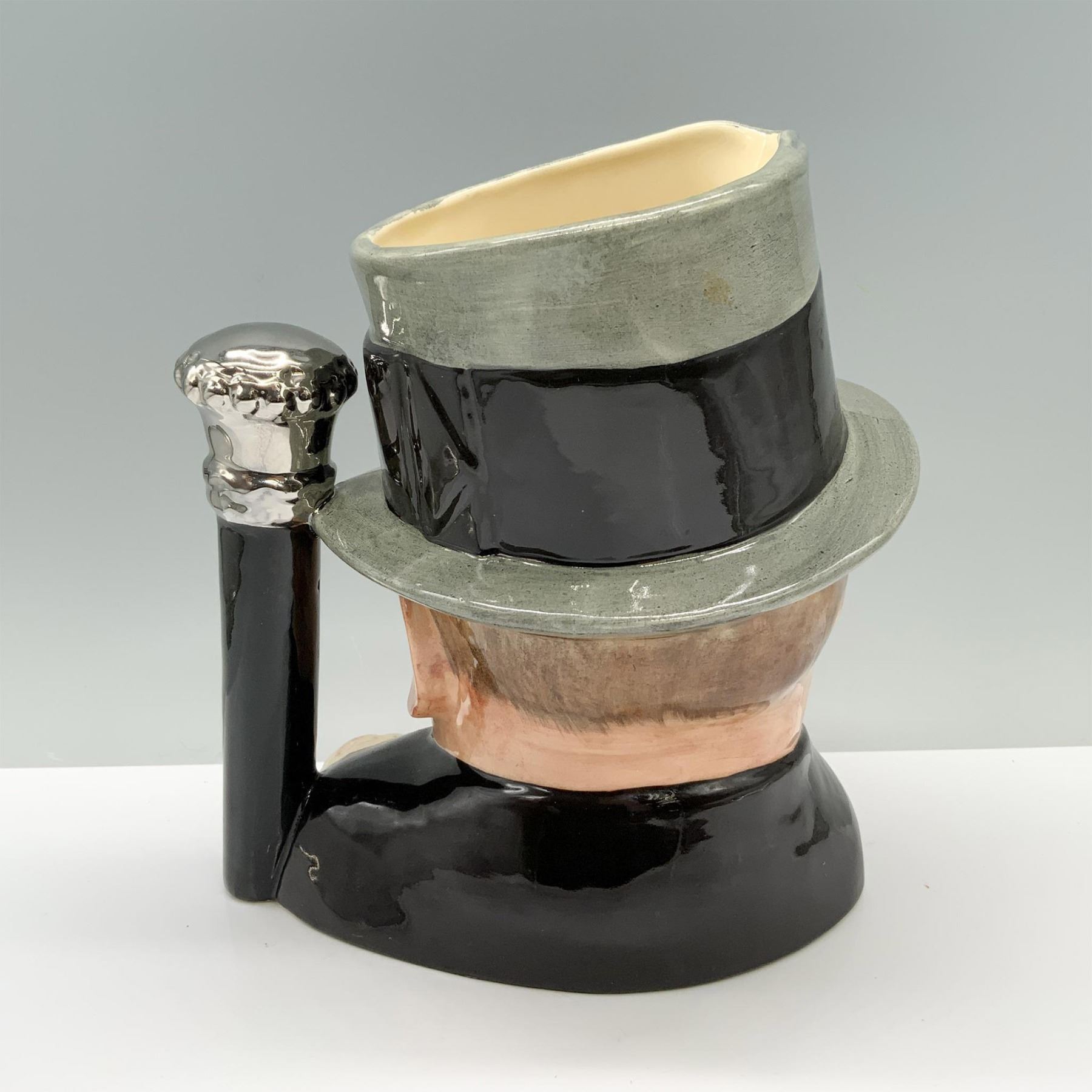 A jug depicting W.C. Fields in a black and yellow suit with a pink carnation and a top hat that also features his cane as the handle. Royal Doulton backstamp.