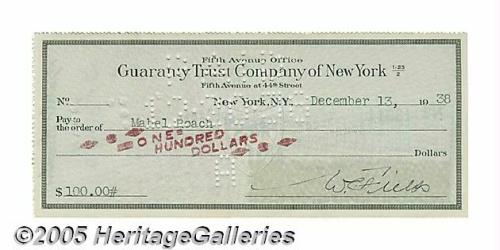 <B>W. C. Fields Signed Check.</B></I> Personal check written for $100 and dated December 13, 1938, signed by comedian W. C. Fields in black ink. In very good condition with some tanning around the signature and the usual cancellation marks. <I>With COA from PSA/DNA.</B></I>