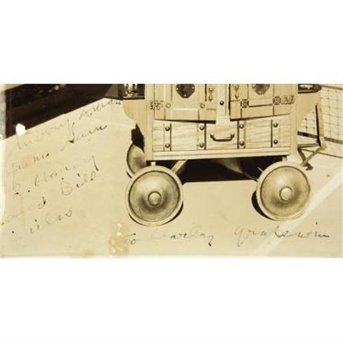 <B>W.C. Fields Signed Photo Inscribed to Charley Grapewin.</B></I> A sepia 7" x 9" photograph of W.C. Fields inscribed "Merry Xmas from Sam R. Hardy and Bill Field To: Charley Grapewin." This amusing photograph shows a young Fields in true form on the court, mixing a drink in one hand and a racket at the ready in the other. Interestingly, the only joint project executed by Fields and Hardy was <I>Man on the Flying Trapeze,</B></I> which premiered in August 1935 just before Hardy's death in October of the same year. In Good condition with frayed edges, a hole on the left side, wrinkles at the top, and water damage to the lower edge. <I>Accompanied by a COA from PSA/DNA.</B></I><BR><BR><b>Shipping:</b> Flat Material, Small (<a target="_blank" href="http://www.heritageauctions.com/common/shipping.php">view shipping information</a>)