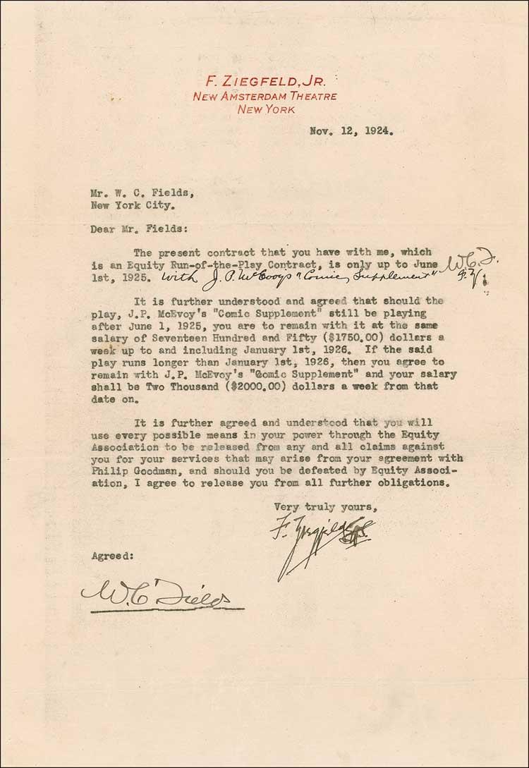 DS, one page, 7.25 x 10.5, November 12, 1924. Agreement between Fields and Ziegfeld concerning the continuation of a play entitled Comic Supplement for his salary of $1750 per week, with his salary increasing to $2000 per week should the run continue into 1926. Signed at the conclusion by Ziegfeld and at the bottom by Fields. Both gentlemen have also initialed a small notation in Ziegfeld’s hand. Intersecting folds, and scattered creases, otherwise fine condition. Pre-certified PSA/DNA and RRAuction COA.
