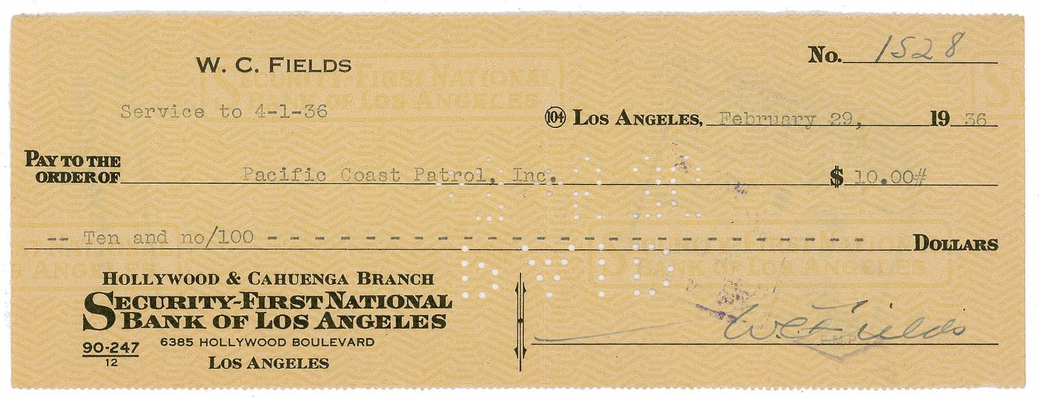 Personal check, 8.25 x 3, filled out in type and signed by Fields, payable to Pacific Coast Patrol, Inc. for $10.00, February 29, 1936. Central vertical fold, expected bank stamps and holes (with stampings affecting his signature), some scattered light toning, faint show-through from stamps on the reverse, otherwise fine condition.