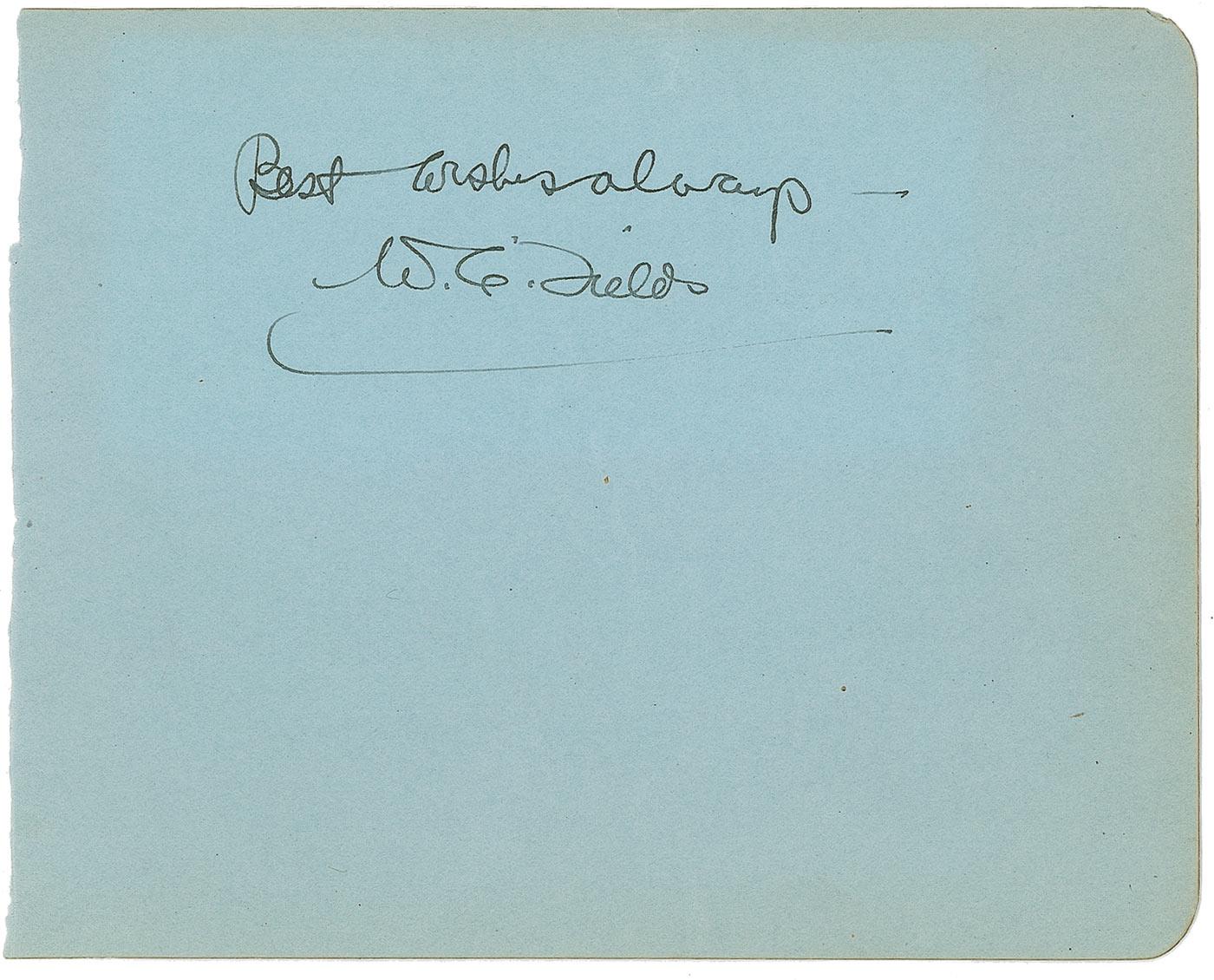 Vintage fountain pen signature, “Best wishes always–W. C. Fields,” on a light blue 5.25 x 4 album page. In fine condition, with some scattered light edge toning.