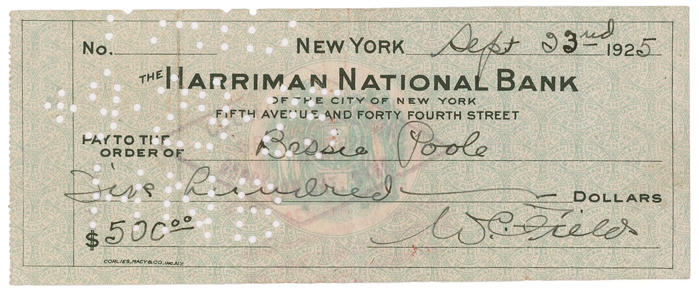 Bank check, 5.75 x 2.25, filled out and signed by Fields, payable to Bessie Poole for $500.00, September 23, 1925. In very good condition, with three vertical folds, one through a single letter of signature, some scattered light toning and soiling, and cancellation holes to left side.