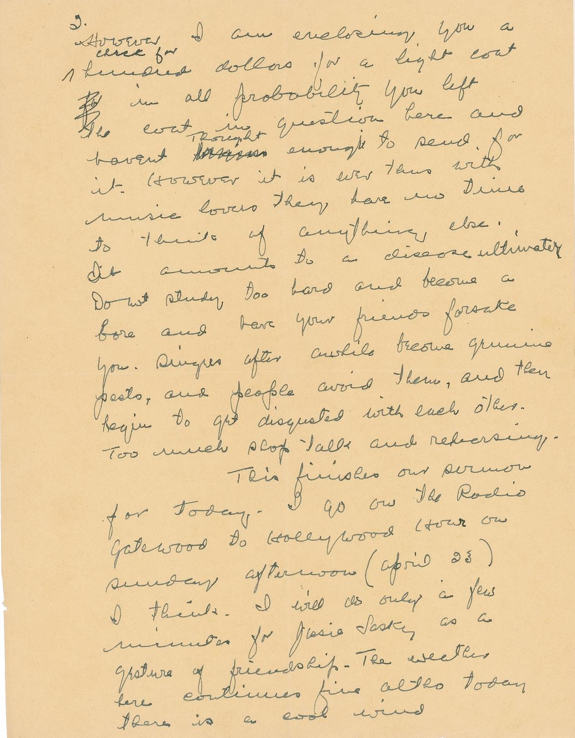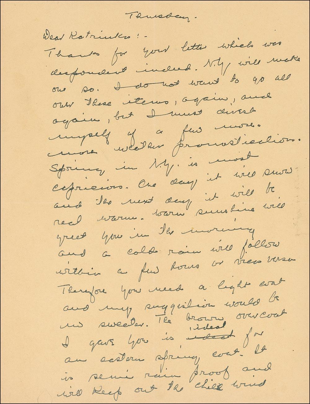 ALS signed “The G[reat] M[an],” three pages, 8.5 x 11, no date. Letter to his mistress Carlotta Douglas, referred to in the greeting as “Katrinka.” After opening about the New York weather and what she should pack for her visit, Fields writes, In part: “I am enclosing you a check for a hundred dollars for a light coat in all probability you left the coat in question here and haven’t enough to send for it. However it is ever thus with music lovers they have no time to think of anything else. It amounts to a disease ultimately. Do not study too hard and become a bore and have your friends forsake you. Singers after a while become genuine pests, and people avoid them, and then begin to get disgusted with each other. Too much shop talk and rehearsing. This finishes the sermon for today…