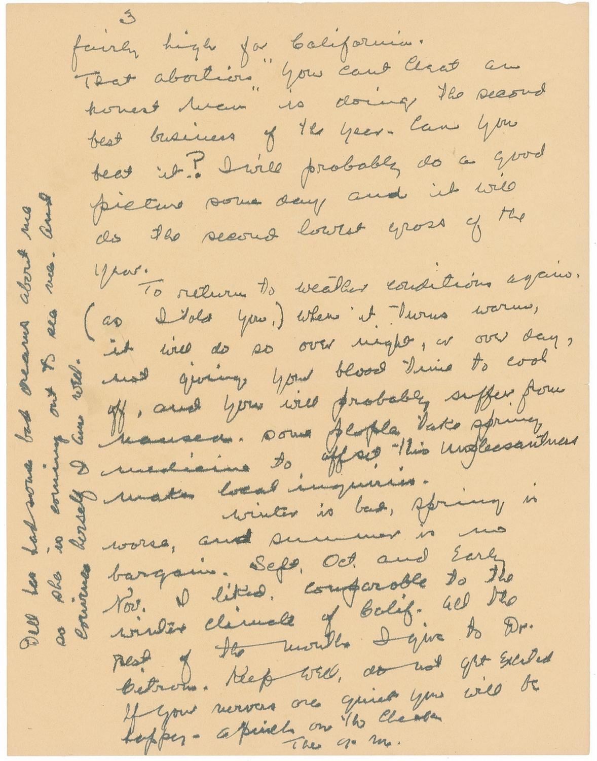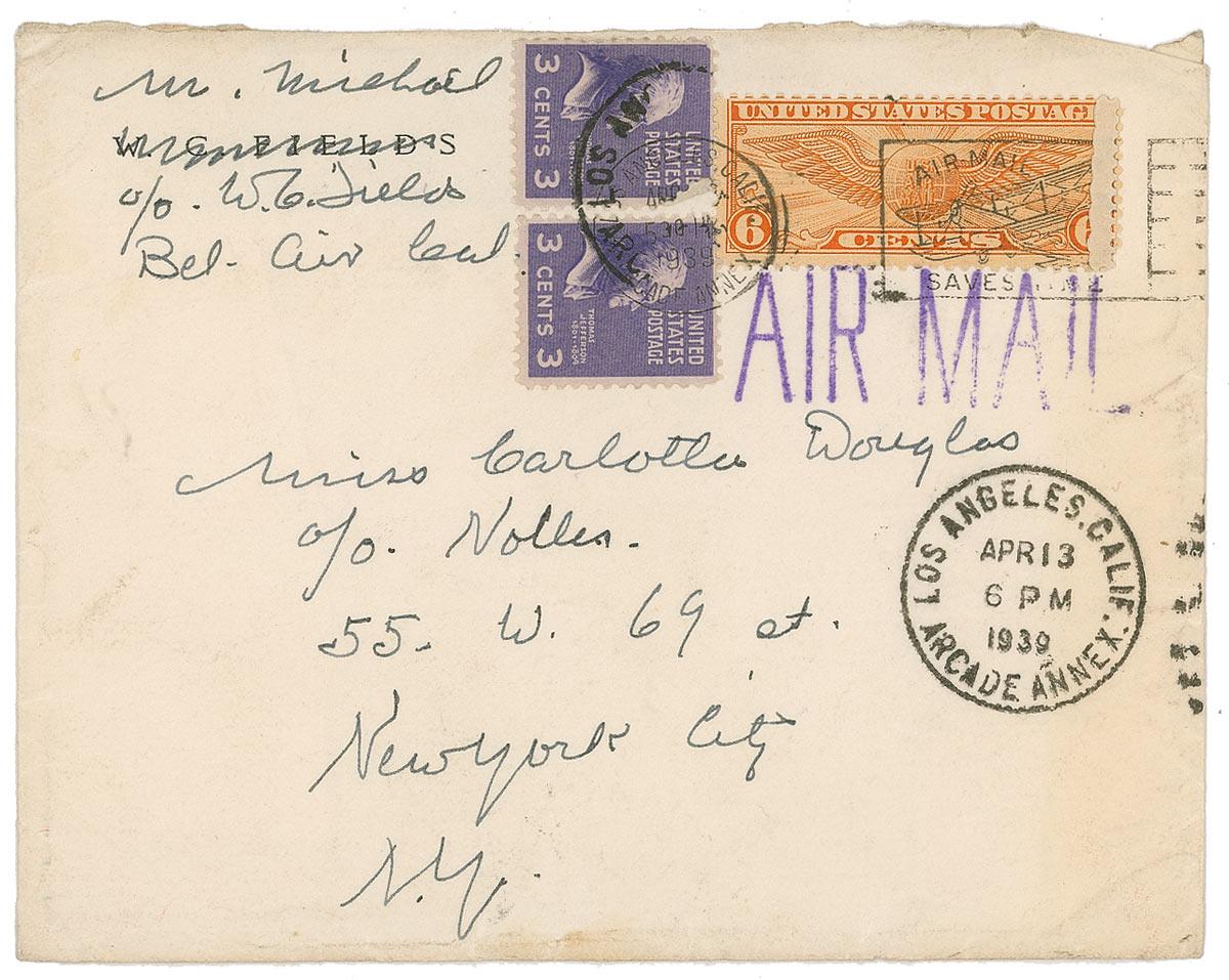 That abortion ‘You Can’t Cheat an honest man’ is doing the second best business of the year. Can you beat it? I will probably do a good picture some day and it will do the second lowest gross of the year. To return to the weather conditions again, (as I told you) when it turns warm, it will do so over night, or over day, not giving your blood time to cool off, and you will probably suffer from nausea…Winter is bad, Spring is worse, and summer is no bargain. Sept., Oct., and early Nov. I liked comparable to the winter climate of Calif. All the rest of the months I give to Dr. Citron.” On the last page, Fields also adds a vertical postscript which reads, “Dell has had some bad dreams about me so she is coming out to see me. And convince herself I am well.” In fine condition, with central horizontal and vertical fold, some mild toning, and light feathering to last half page of text. Accompanied by the original mailing envelope, addressed in Fields’s hand and signed in the return address area, “c/o W. C. Fields.”