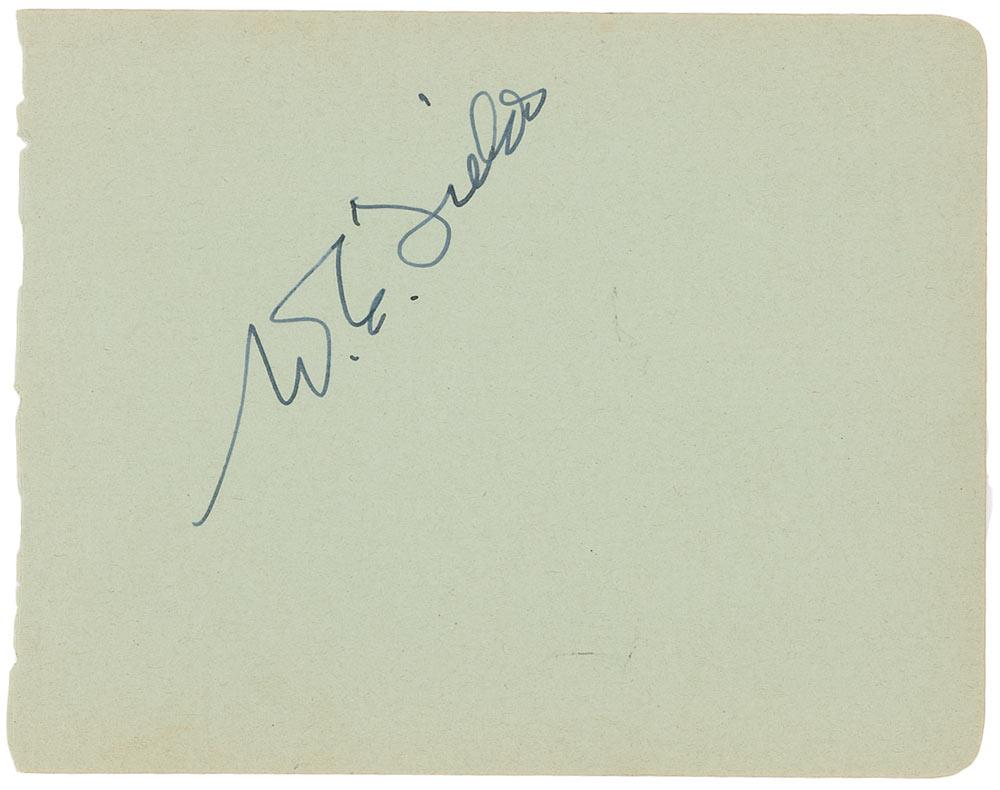 Vintage fountain pen signature, “W. C. Fields,” on a light green 5.5 x 4.5 album page. In fine condition.