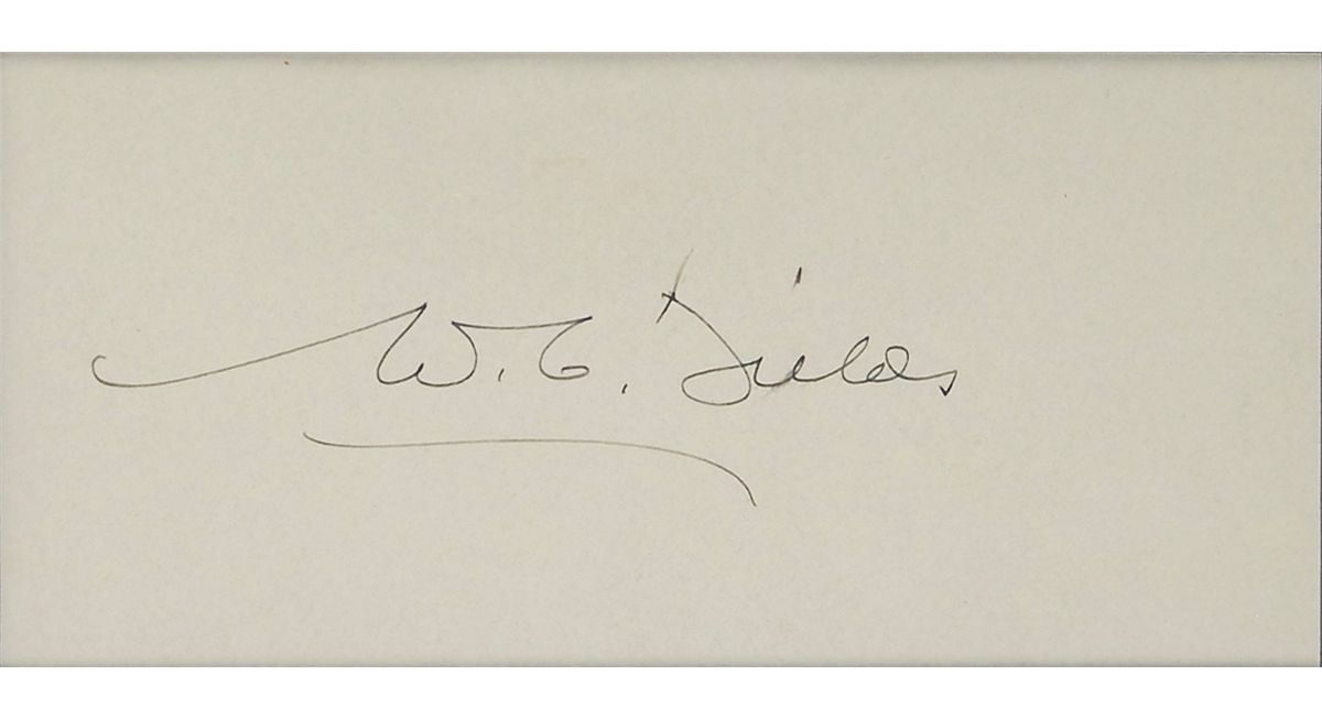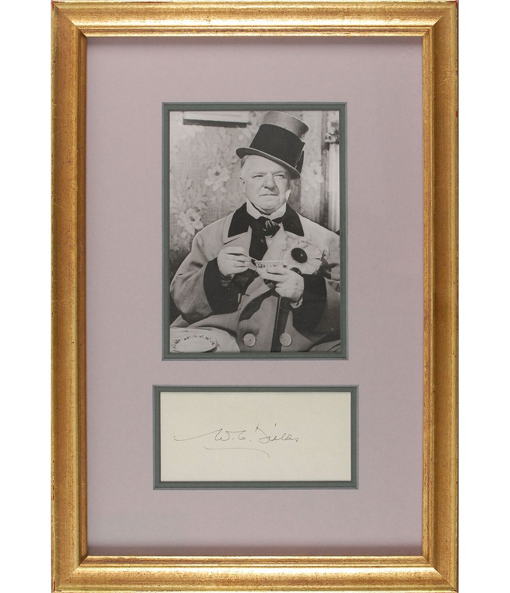 Fountain pen signature, “W. C. Fields,” on an off-white 5.25 x 2.5 album page. Double-matted and framed with a photo of Fields in a frock coat to an overall size of 11.5 x 16.5. In fine condition.