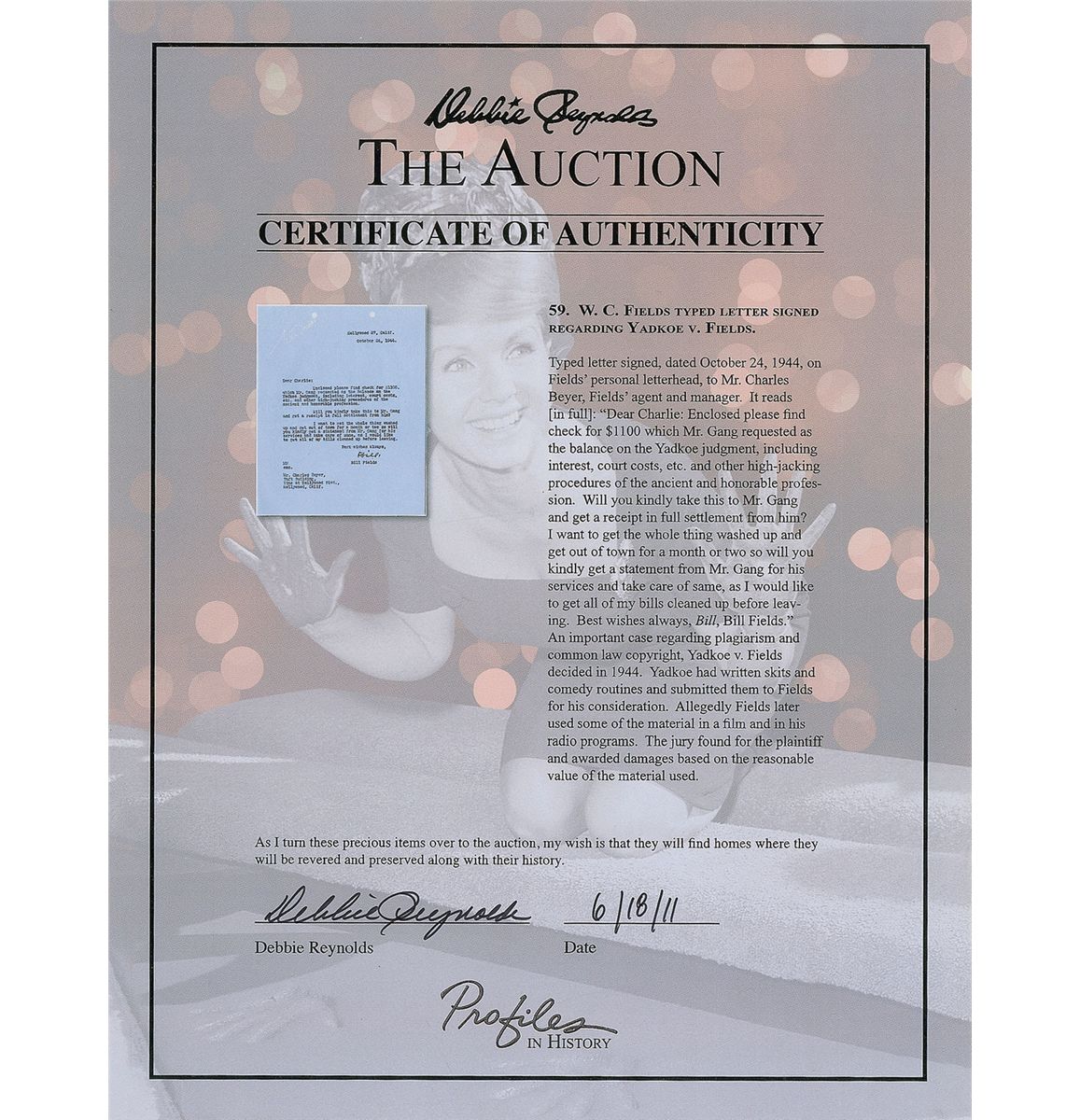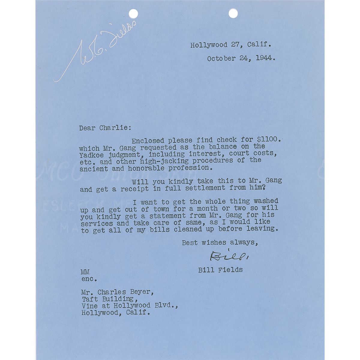 TLS signed “Bill,” one page, 8 x 10, personal letterhead, October 24, 1944. Letter to Charles Beyer, his agent and manager. In full: “Enclosed please find check for $1100, which Mr. Gang requested as the balance on the Yadkoe judgment, including interest, court costs, etc. and other high-jacking procedures of the ancient and honorable profession…I want to get this whole thing washed up and get out of town for a month or two.” In very fine condition, with filing holes to the top. Originates from the Debbie Reynolds sale held in 2011, and is accompanied by letter of provenance signed by the actress. The case Fields refers to, Yadkoe v. Fields, was an early and important case involving the protection of intellectual property—Harry Yadkoe had sent a few skits and comedic sketches to Fields for his consideration, and Fields allegedly used these ideas in later work without providing compensation. The jury found in favor of Yadkoe and awarded him $8,000 in damages, a decision which Fields then brought to appellate court; the decision was upheld.