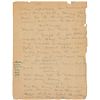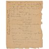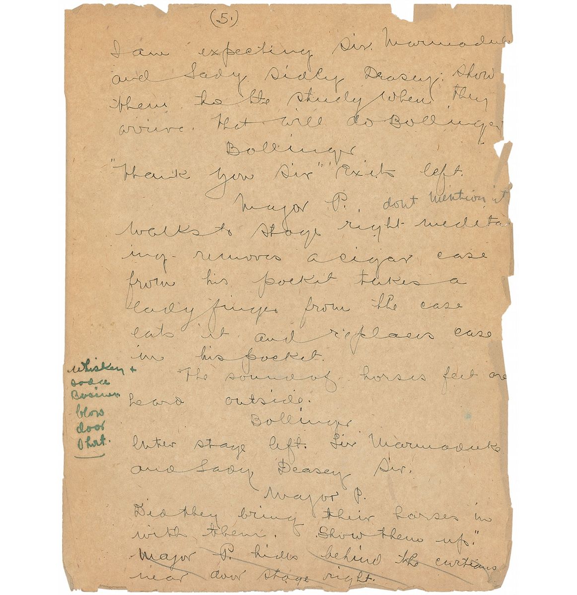 Exceptional handwritten manuscript, titled and signed at the top, “The Untold Story, The Schemers, by W. C. Fields,” five pages, 8.5 x 11, no date but circa early 1920s. Fields’s original draft outlining the setting and dialogue for a dramatic scene, apparently for his one-act play entitled ‘What a Night.’ Fields lists the characters at the top, “Sir Marmaduke Gump,” “Lady Sidley Deasey,” “Major Pothlewhistle," and “Bollinger—a servant,” adding notes on behavior and setting, “When Gump is offered a cigar, he takes a handful,” “Closet filled with well-known brands of booze. Open closet so audience can get a peep,” and “All get together to talk quietly over papers, when servant walks through room with squeaky shoes.” Fields made copious corrections and revisions throughout in various inks and pencil. Housed in an attractive custom-made clamshell case with a gilt-stamped leather spine. In very good condition, with overall creases and wrinkles, and various tears and paper loss to edges. Accompanied by a typed transcript. Fields copyrighted the play ‘What a Night’ in 1921, characterized as a humorous absurdist piece. A terrific showcase of Fields’s talent in writing comedy, with great dialogue and slapstick gimmicks.
