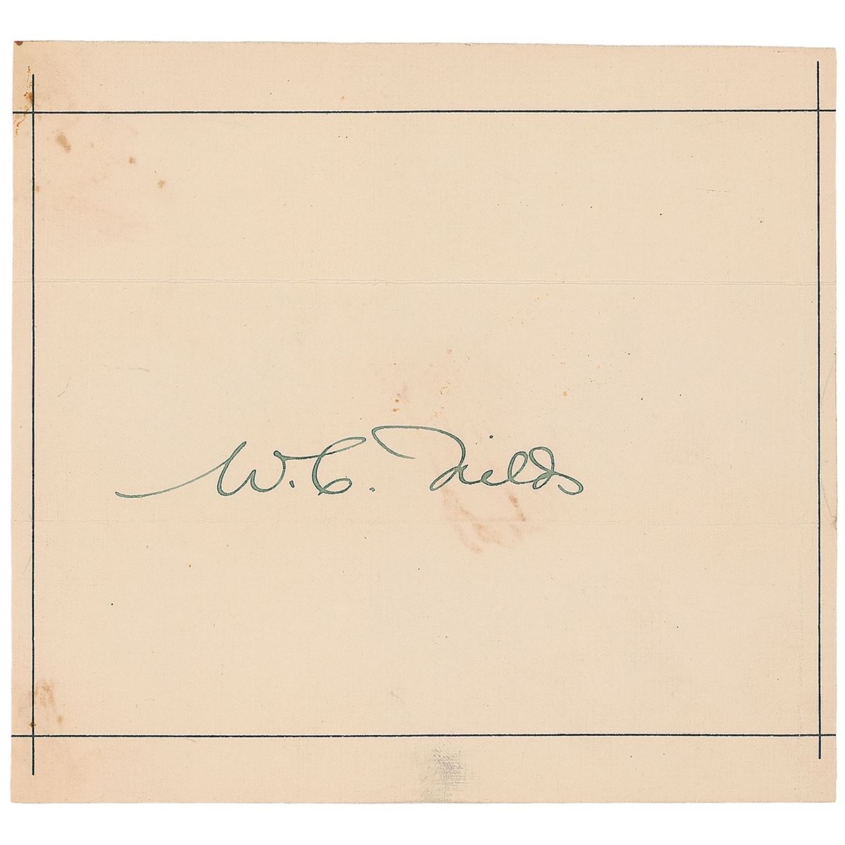 Fountain pen signature, “W. C. Fields,” on an off-white 5.75 x 5.25 sheet. Intersecting folds, show-through from adhesive to reverse, and evenly trimmed edges, otherwise fine condition.