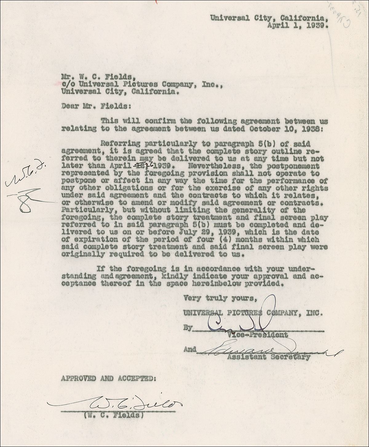 DS, one page, 8.5 x 10.25, April 1, 1939. Fields agrees to a provision in a contract for a "complete story outline" he is to deliver to Universal Pictures before "but not later than April 26, 1939." Signed at the conclusion in black ink by Fields, who adds his initials to the left border to approve a date change. In fine condition, with expected document wear.