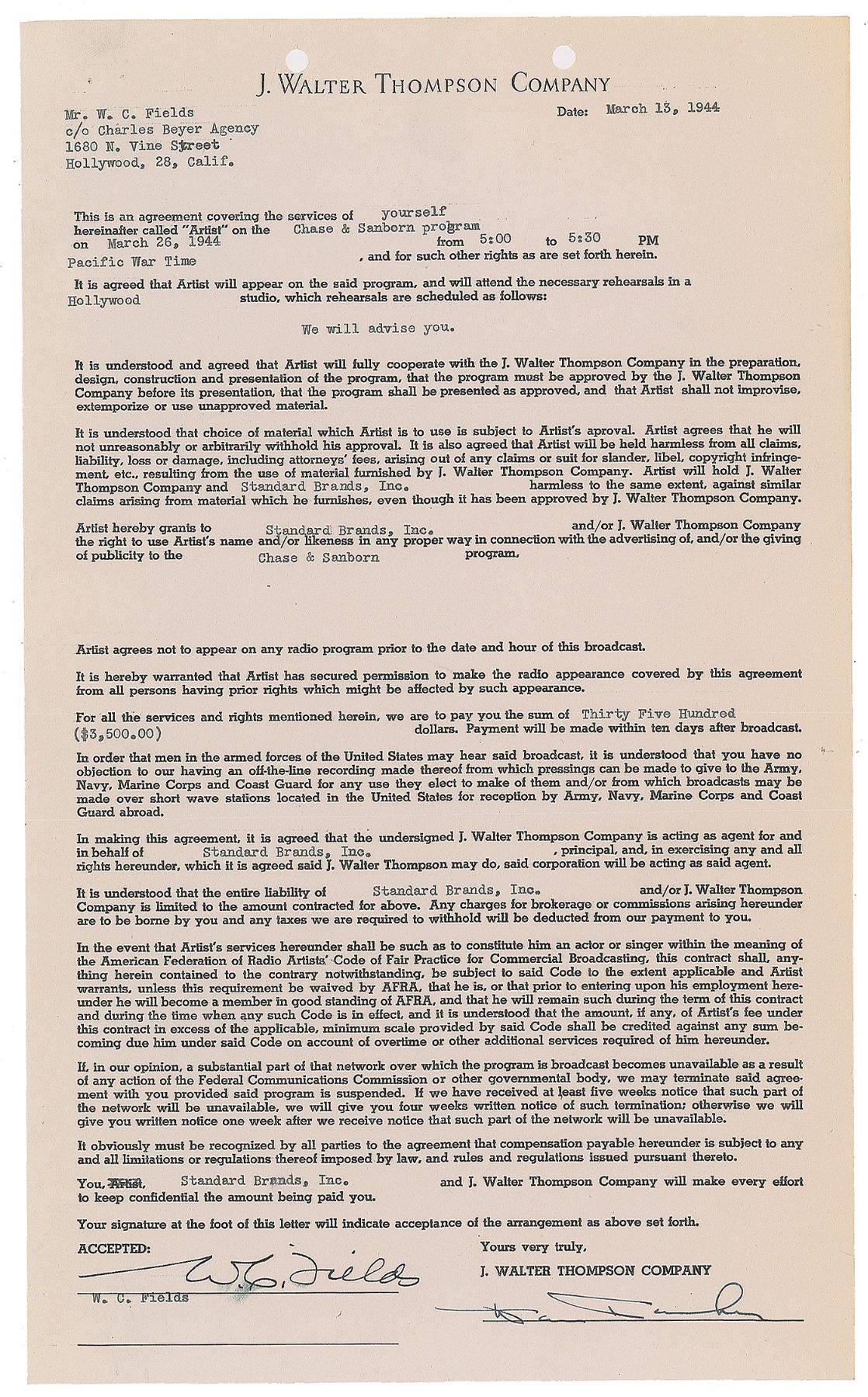 DS, one page, 8.5 x 14, March 13, 1944. Agreement between Fields and the J. Walter Thompson Company for him to appear "on the Chase & Sanborn program" on March 26, 1944. Signed at the conclusion in fountain pen by Fields and a company representative. In fine condition, with a brush to Fields' middle initial.