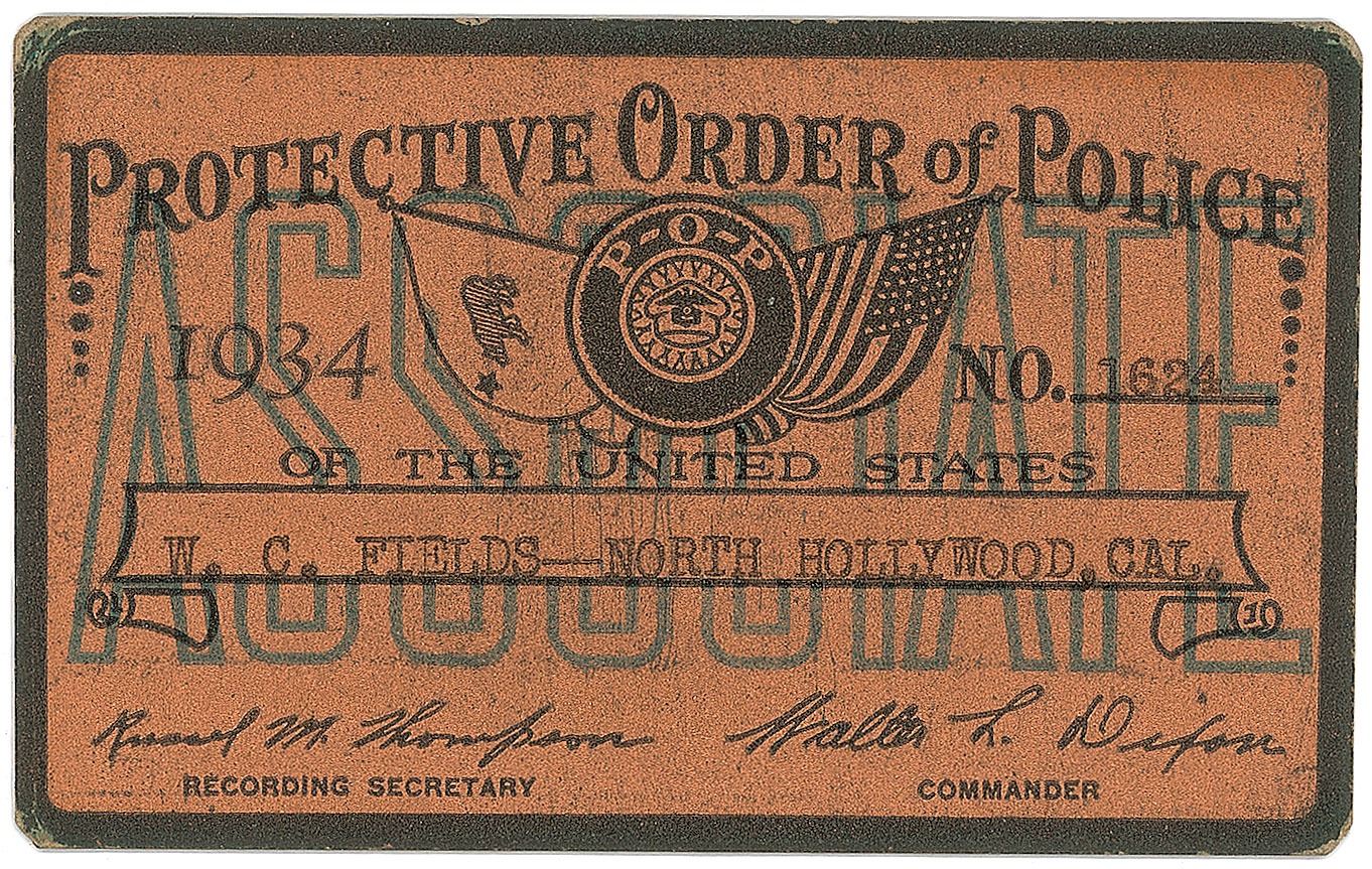 Protective Order of Police of the United States 'associate' card for the year 1934, issued to "W. C. Fields—North Hollywood, Cal.," 3.5 x 2.24, No. 1624, with reverse stating: "The holder has been promised no favors or immunity from any Police Officer member, by reason of the issuance thereof." In fine condition.