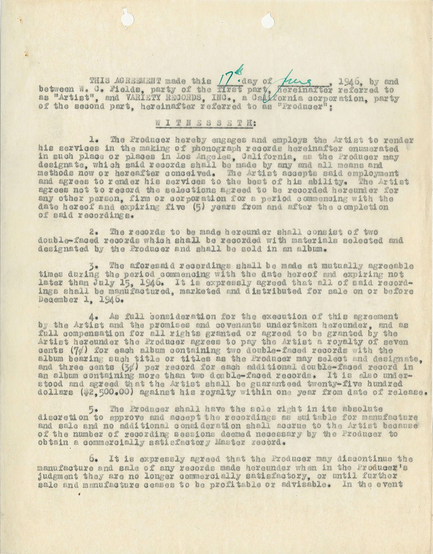 DS, three pages, 8.5 x 11, June 17, 1946. Contract between Variety Records and W. C. Fields, in which the latter agrees to make "two double-faced records" for royalties and a guaranteed sum of $2,500. Signed at the conclusion in blue ballpoint by Fields, who also adds his initials to an emendation on the second page. In fine condition.