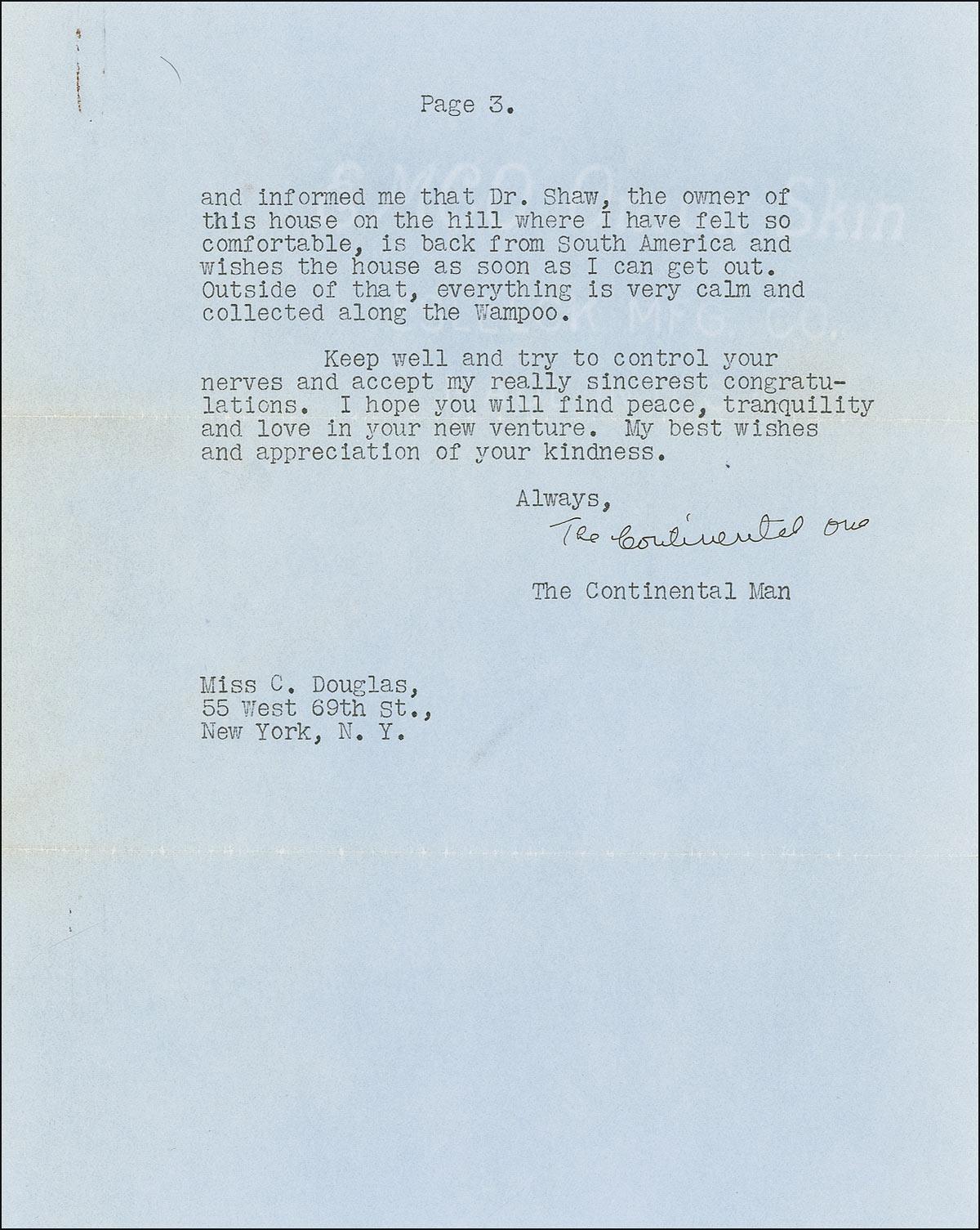 TLS signed “The Continental One,” three pages, 8 x 10, personal letterhead, September 12, 1939. Fields writes to his mistress Carlotta Monti, whom he refers to as “Katrincka.” In part: “You must make up your own mind. If you are assured the man you are going to marry can take care of you in your old age and that is what you most desire, you should go ahead. I have given deep thought of how to protect one’s self from poverty in old age but have never found a solution. When I get an idea and analyse [sic] it thoroughly, I always find so many things can happen…Nothing is certain but death.