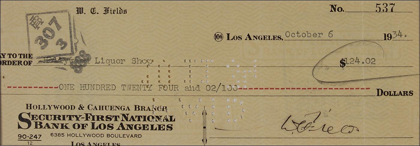 Personal check, 8 x 3, filled out in type and signed by Fields, payable to Hollywood Liquor Store for $124.02, October 6, 1934. Matted with a photo of Fields, to an overall size of 11 x 14. Two vertical folds, expected cancellation holes and stamps, pencil mark to body, and a light brush to signature, otherwise fine condition.