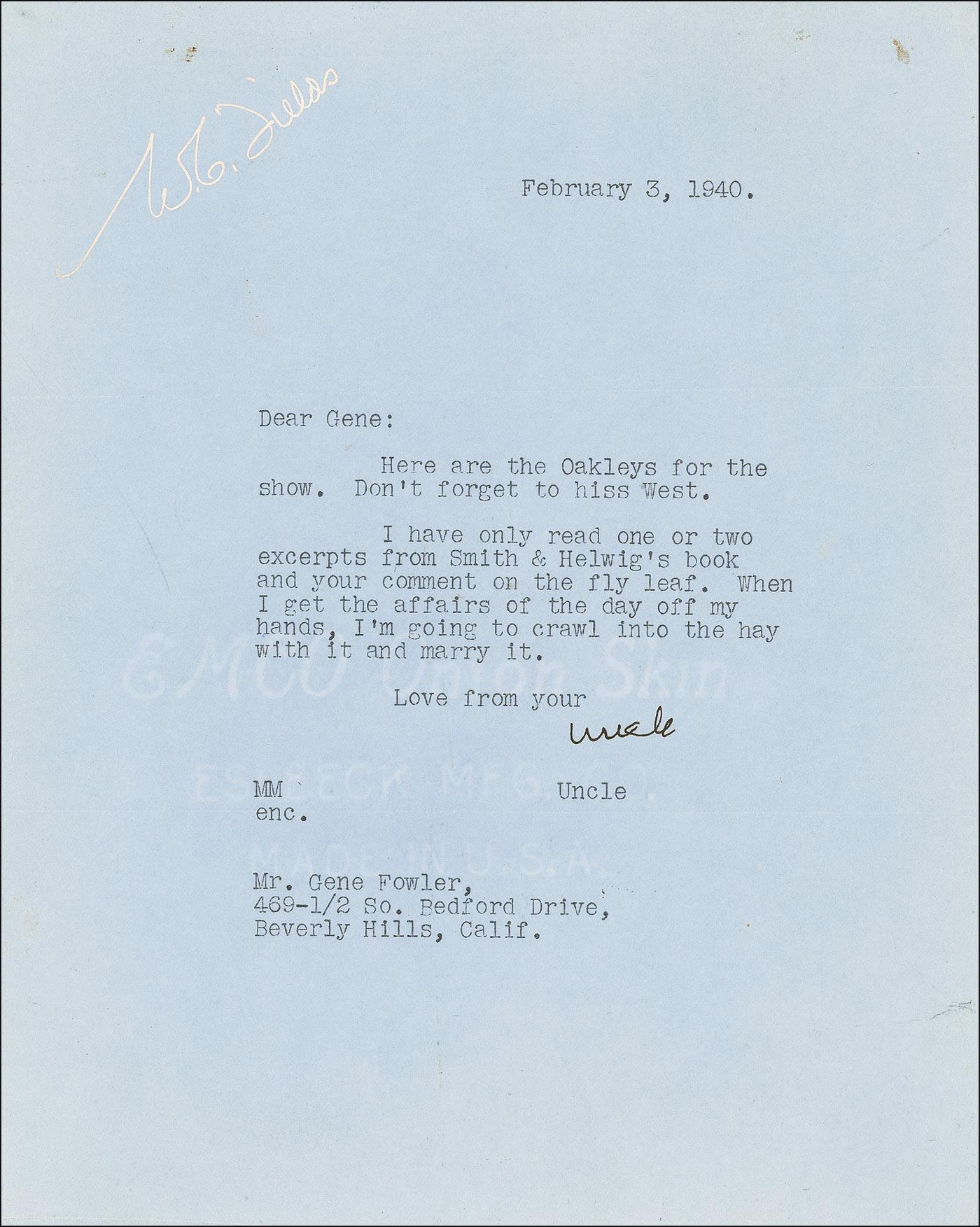 TLS signed “Uncle,” one page, 8 x 10, personal letterhead, February 3, 1940. Short letter to his friend, author Gene Fowler. In full: “Here are the Oakleys for the show. Don’t forget to hiss West. I have only read one or two excerpts from Smith & Helwig’s book and your comment on the fly leaf. When I get the affairs of the day off my hands, I’m going to crawl into the hay with it and marry it.” In fine condition, with light creasing and soiling.