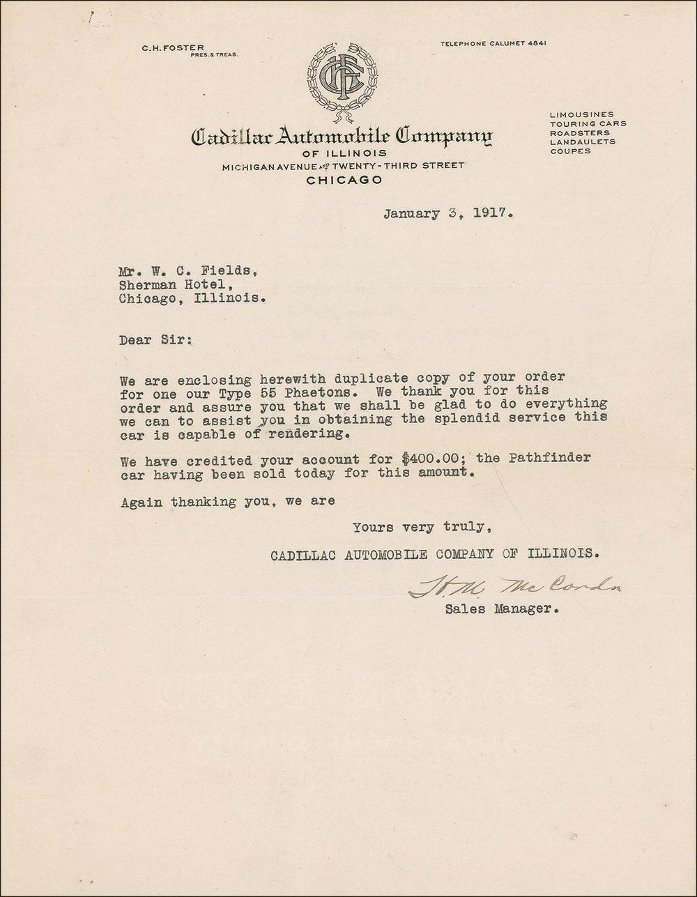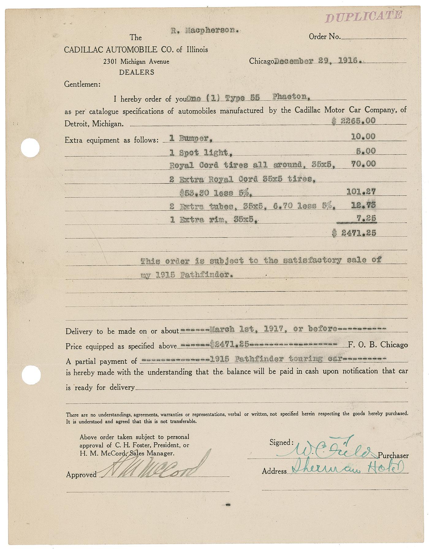 DS, signed “W. C. Fields, Sherman Hotel,” one page, 8.5 x 11, December 29, 1916. A contract for the purchase of “One (1) Type 55 Phaeton…. Extra equipment as follows: 1 Bumper 10.00, 1 Spot light 5.00, Royal Cord tires all around, 35 X 5, 70.00, 2 Extra Royal Cord 35 X 5 tires 101.27, 2 Extra tubes 12.73, 1 Extra rim 35 X 5 7.25, [Total] $2,471.25. This order is subject to the satisfactory sale of my 1915 Pathfinder….” A cover letter to Fields, dated January 3, 1917, is included. Expected document wear and holes, a mild shade of toning, and an office stamp to top right, otherwise fine condition. Accompanied by a full letter of authenticity from PSA/DNA.