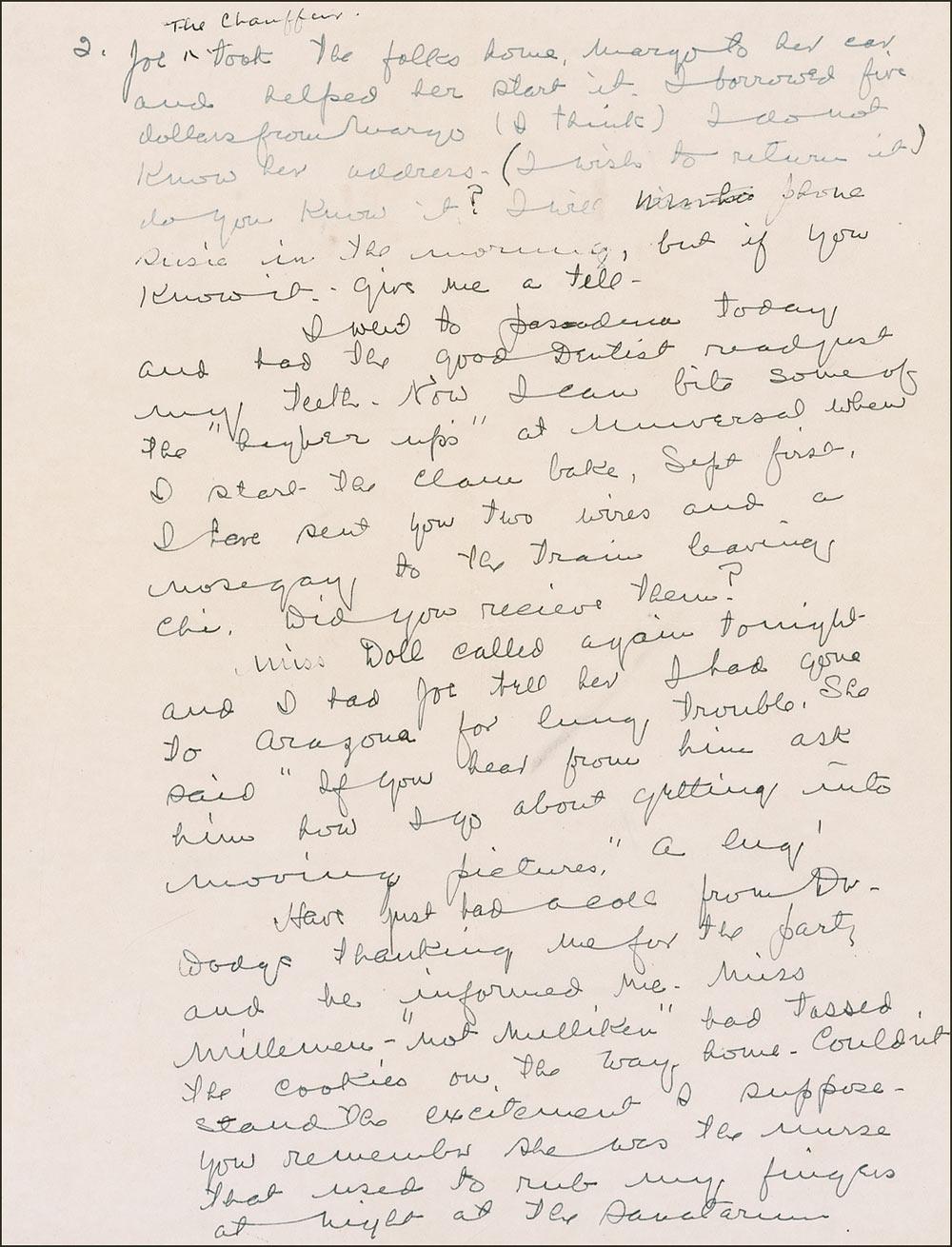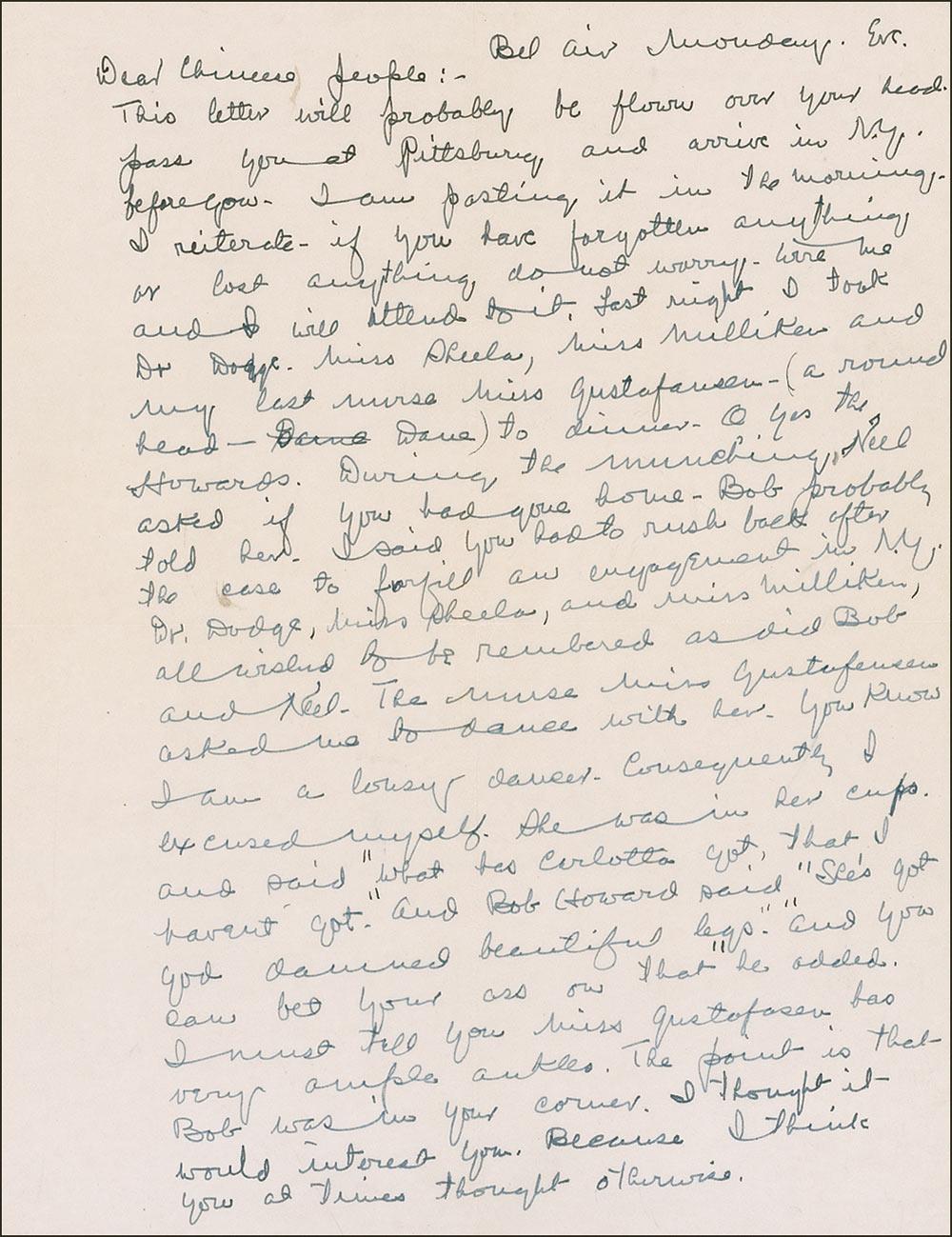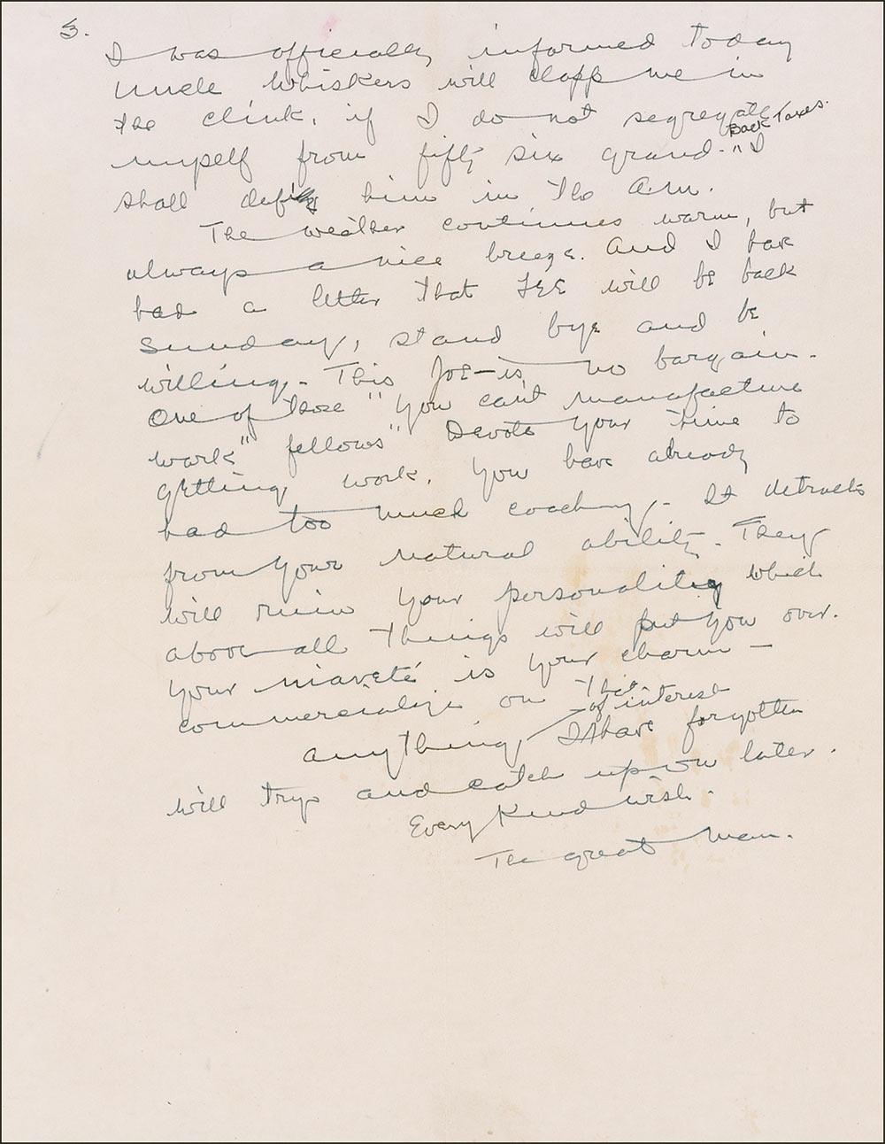 ALS signed “The great man,” three onionskin pages, 8.5 x 11, no date. Letter to his mistress Carlotta Douglas. In part: “This letter will probably be flown over your head, pass you at Pittsburg [sic], and arrive in N.Y. before you…Miss Doll called again tonight and I had Joe tell her I had gone to Arazona [sic] for lung trouble. She said ‘If you hear from him ask him how I go about getting into moving pictures.’ A lug!…Dr. Dodge informed me Miss Millevere…had tossed the cookies on the way home. Couldn’t stand the excitement I suppose. You remember she was the nurse that used to rum my fingers at night at the sanatarium. I was officially informed today Uncle Whiskers will clapp me in the clink, if I do not segregate myself from fifty six grand back taxes. I shall defy him in the a.m.” In fine condition, with intersecting folds and a few spots of soiling. Accompanied by the original mailing envelope postmarked July 25, 1939. Great peek into the mind and personal affairs of the legendary actor.