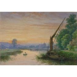 W C Fisher 1912- Riverscene at sunset with house and people, 33cms x 46cms