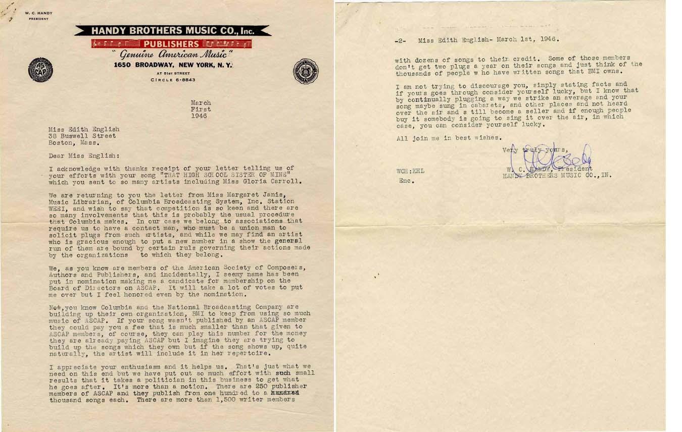 Typed letter signed by blues musician W.C. Handy dated ''March First 1946''. Written upon ''Handy Brothers Music Co., Inc.'' stationery, with the tagline ''Genuine American Music'', letter warns a young composer about the rough and tumble music business. Lengthy letter reads in part, ''…competition is so keen..Now, you know Columbia and [NBC] are building up their own organization…I am not trying to discourage you, simply stating facts and if yours goes through consider yourself lucky…'' On two separate pages, in very good condition.
