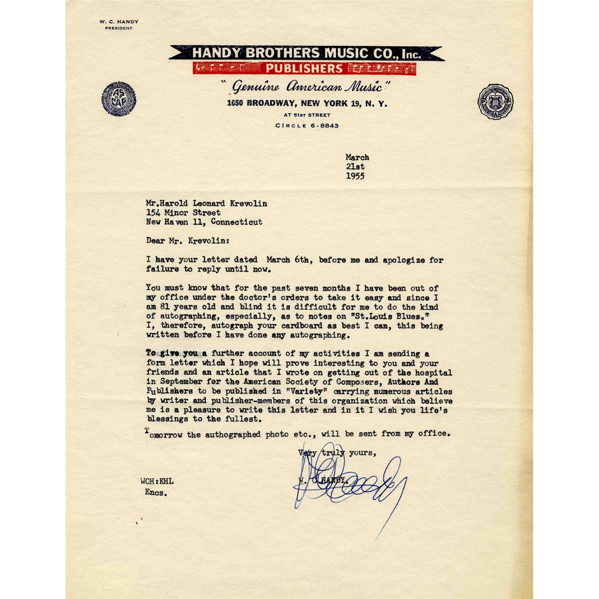 'Father of the Blues'' W.C. Handy typed letter signed on his Handy Brothers Music Co. stationery. Dated 21 March 1955, letter reads in part, ''...since I am 81 years old and blind it is difficult for me to do the kind of autographing, especially, as to notes on 'St. Louis Blues'...I wish you life's blessings to the fullest...W.C. Handy''. Measures 8.5'' x 11''. Near fine condition with only mailing folds and light toning to right margin. Accompanied by JSA COA.