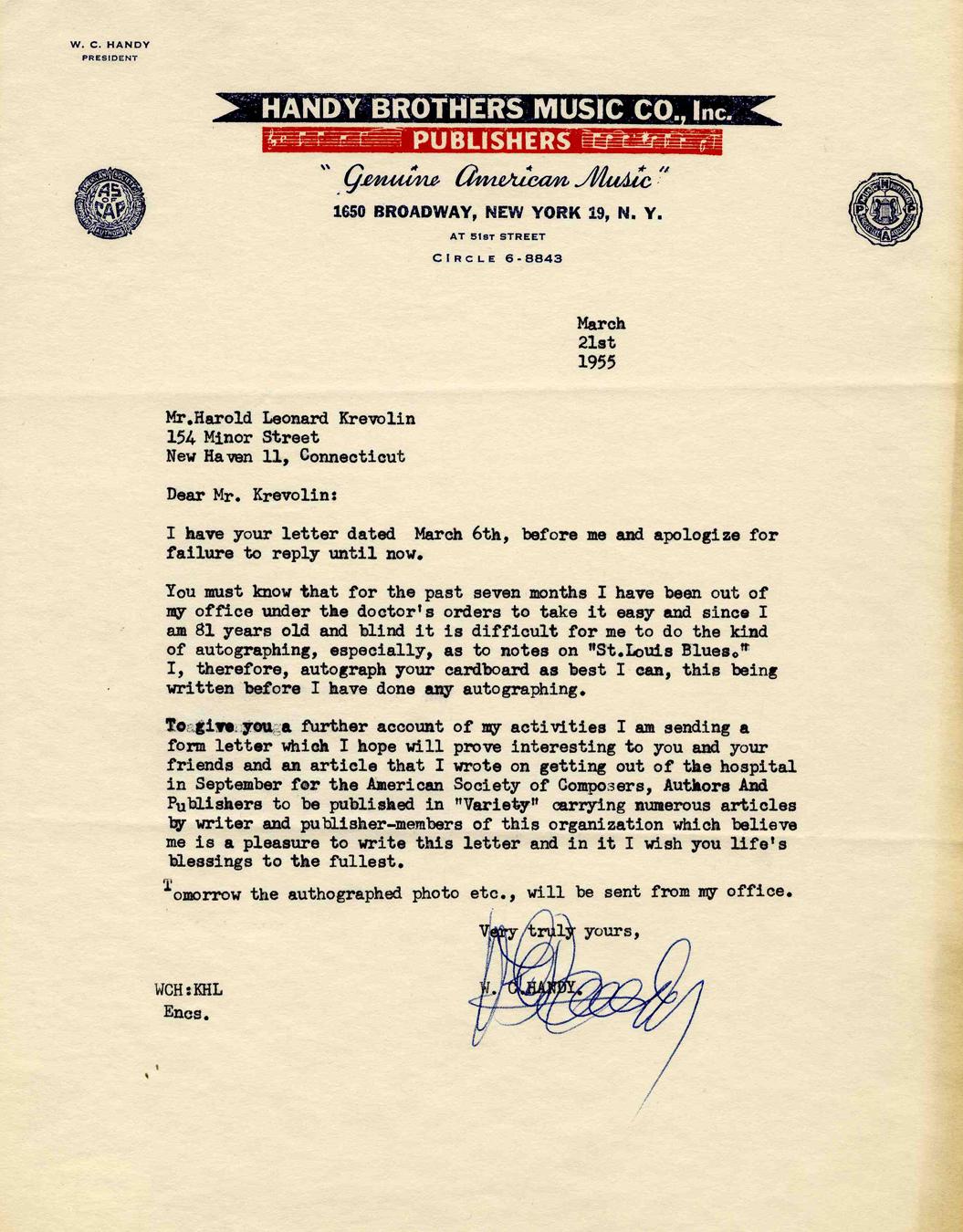 ''Father of the Blues'' W.C. Handy typed letter signed on his Handy Brothers Music Co. stationery. Dated 21 March 1955, letter reads in part, ''…since I am 81 years old and blind it is difficult for me to do the kind of autographing, especially, as to notes on 'St. Louis Blues'…I wish you life's blessings to the fullest…W.C. Handy''. Measures 8.5'' x 11''. Near fine condition with only mailing folds and light toning to right margin. Accompanied by JSA COA.