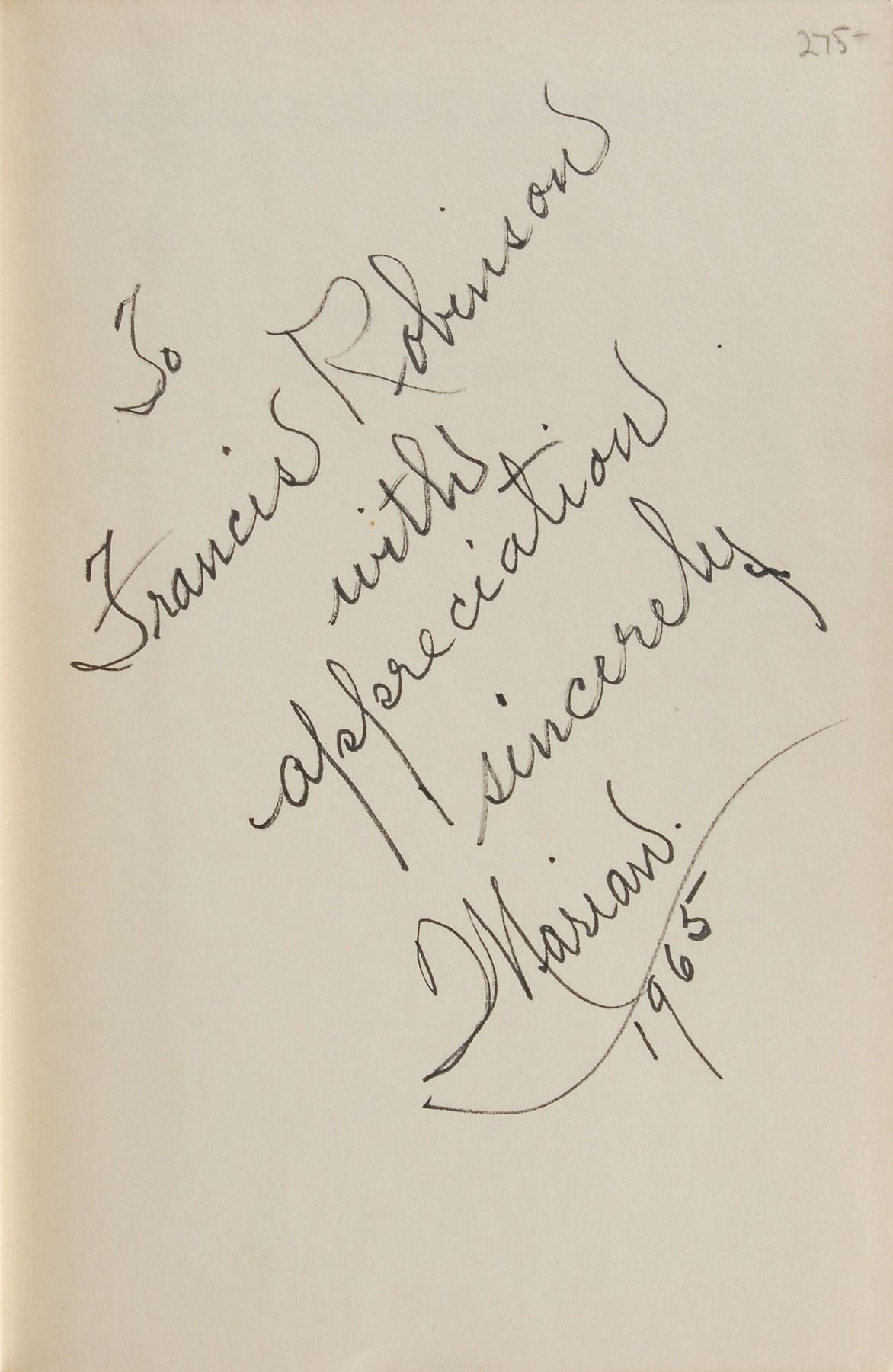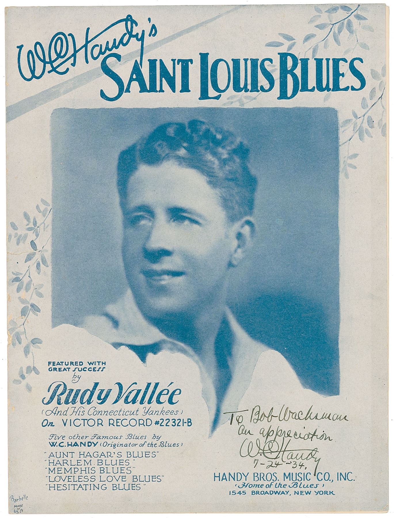 Two items: a hardcover edition of the book My Lord, What a Morning by Marian Anderson, signed and inscribed in black ink on the first free end page, "To Francis Robinson, with appreciation, Sincerely, Marian, 1965"; and a sheet music booklet for 'Saint Louis Blues,' six pages, signed and inscribed on the front cover in fountain pen, "To Bob Wachsman, An appreciation, W. C. Handy, 7-24-34." In overall very good to fine condition. Robinson was assistant general manager of the Metropolitan Opera.