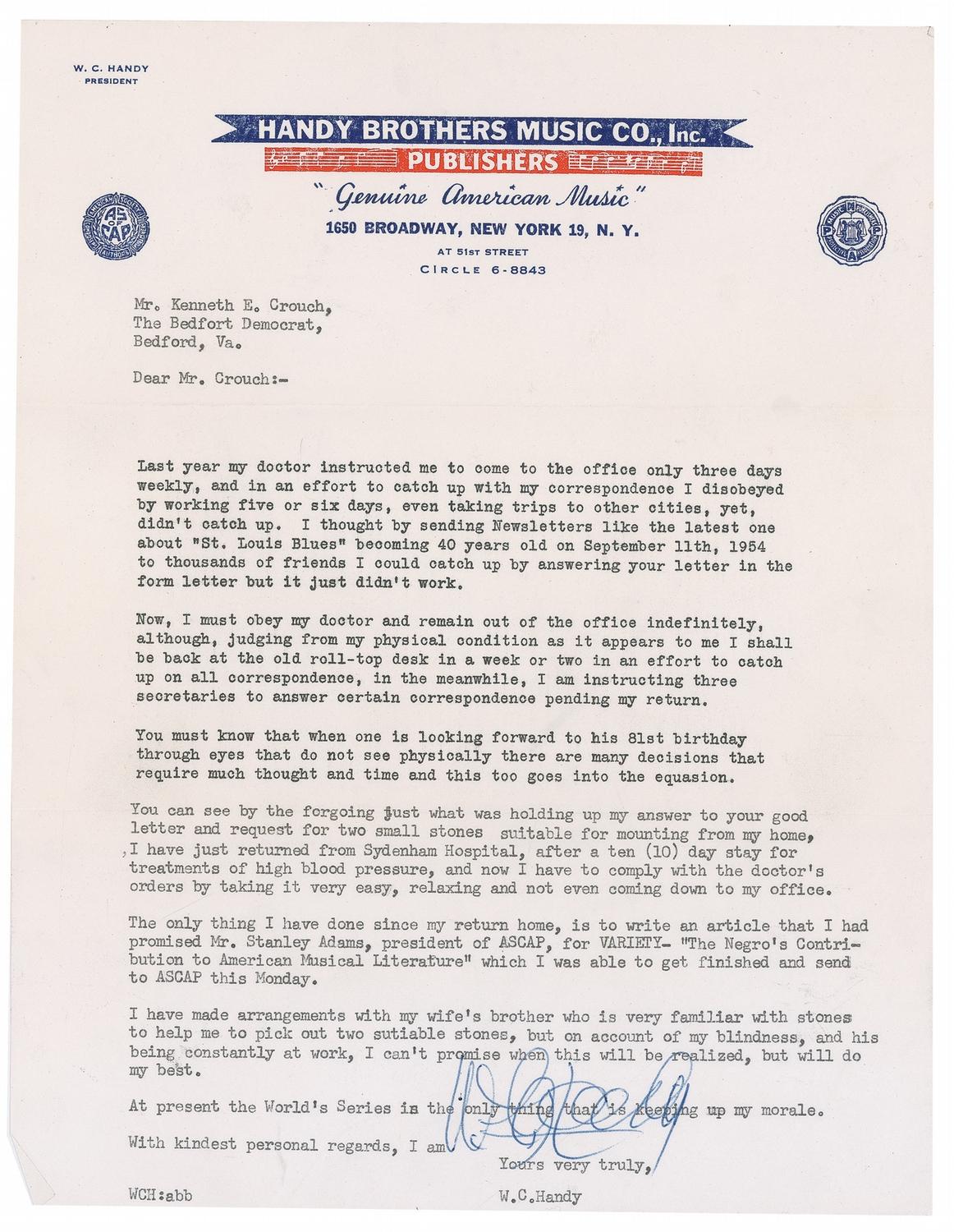 TLS, one page, 8.5 x 11, Handy Brothers Music Co. Inc. letterhead, no date. Letter to a fan. In part: “I must obey my doctor and remain out of the office indefinitely…You must know that when one is looking forward to his 81st birthday through eyes that do not see physically there are many decisions that require much thought and time and this goes into the equasion [sic]…I have just returned from Sydenham Hospital, after a ten (10) day stay for treatments of high blood pressure…The only thing I have done since my return home, is to write an article that I had promised Mr. Stanley Adams, president of ASCAP, for Variety-‘The Negro’s Contribution to American Musical Literature’ which I was able to get finished and to ASCAP this Monday…At present the World Series is the only thing that is keeping up my morale.” In fine condition.