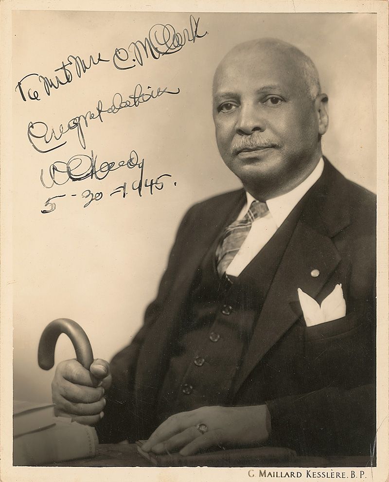 Vintage pearl-finish 8 x 10 photo, signed and inscribed in fountain pen “To Mr & Mrs C. M. Clark, Congratulations, W. C. Handy 5-30-1945.” In very good condition, with scattered creases, mainly to edges, light crazing and surface marks, a light central vertical streak, and scattered silvering.