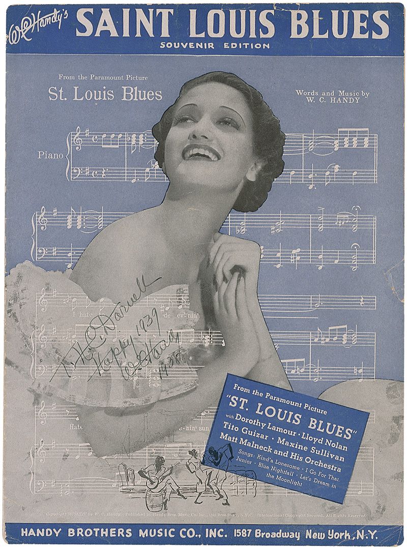 Sheet music to ‘Saint Louis Blues,’ 9 x 12, six pages, signed and inscribed on the front cover in fountain pen, “To H. C. Darnell, Happy 1939, W. C. Handy 1938.” In very good condition, with scattered creasing, toning, and soiling, a few small tears to front cover, and a larger tear to back cover.