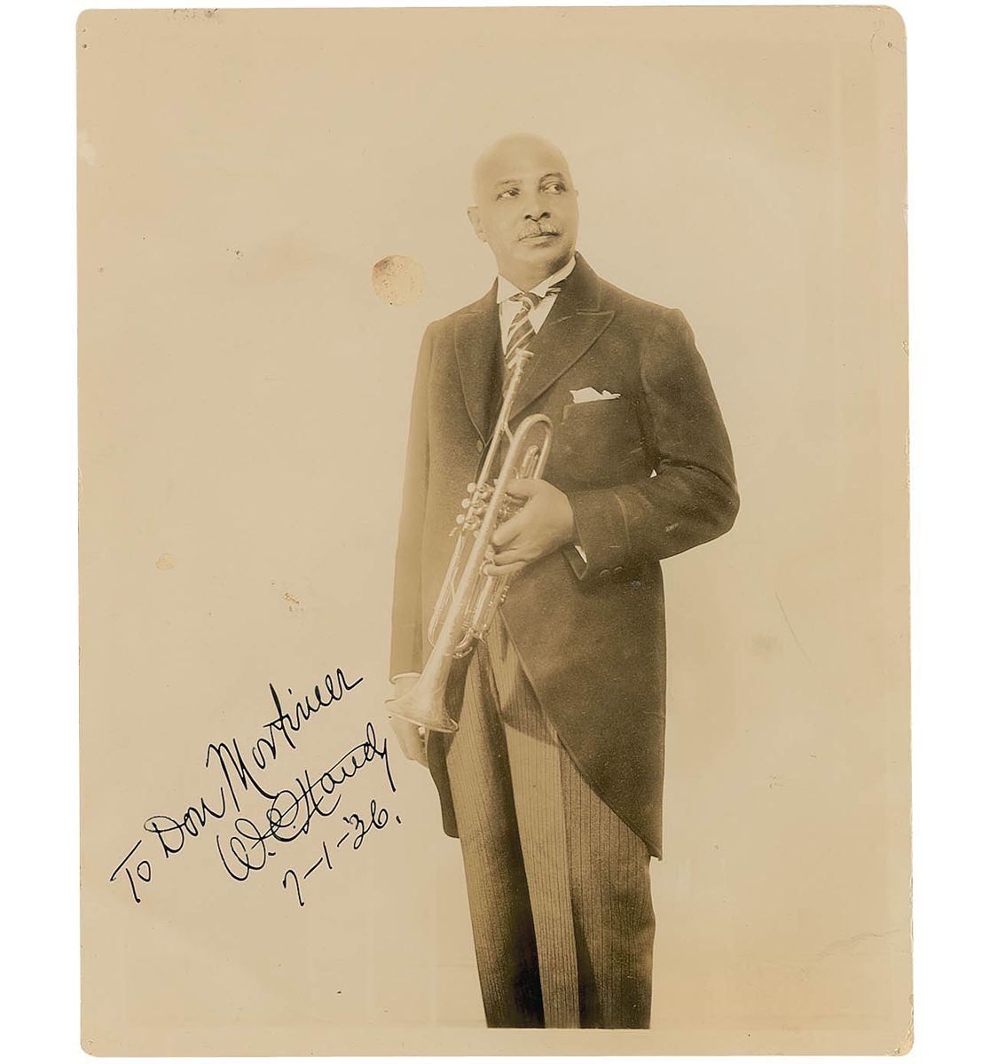 Vintage glossy 8 x 10 photo of Handy with his trumpet, signed and inscribed in fountain pen “To Don Mortimer, W. C. Handy, 7-1-36.” In very good condition, with light scattered surface creases, a spot of soiling near his head, as well as a few smaller spots, and tack holes to each corner.