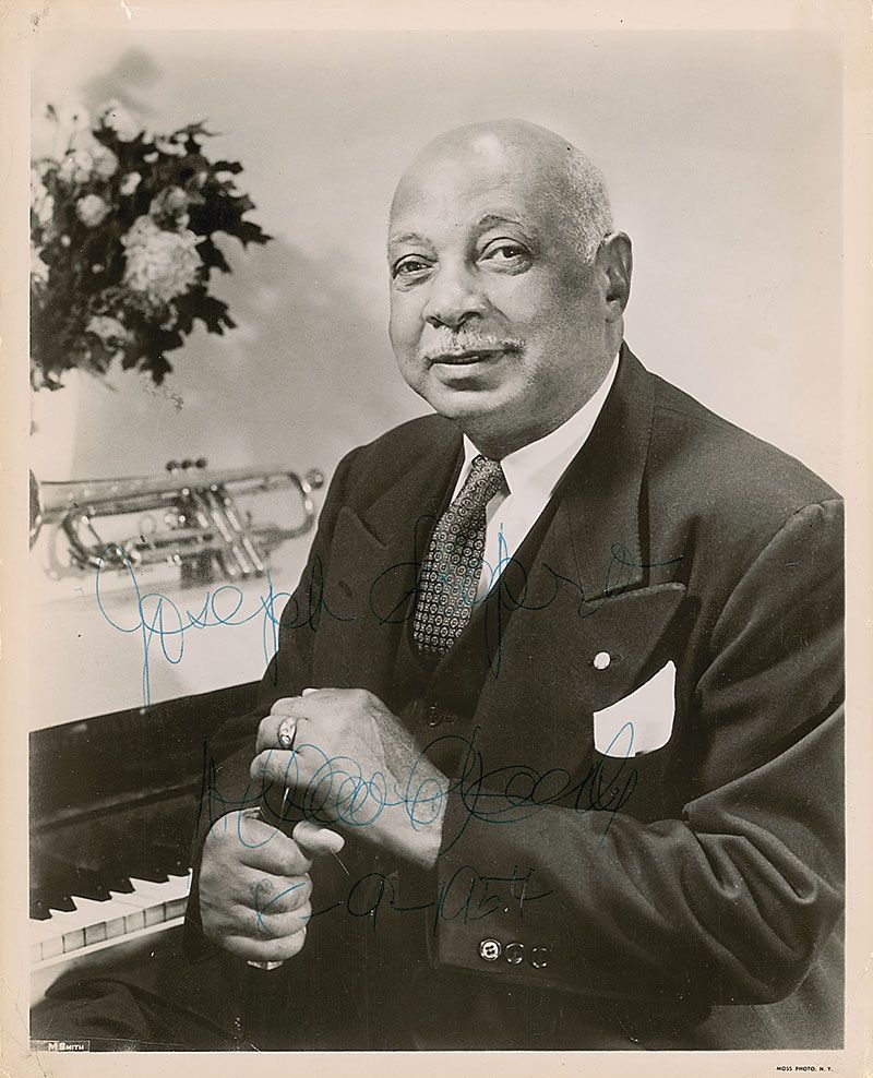 Vintage glossy 8 x 10 photo, signed and inscribed in blue ballpoint “Joseph Shapiro, William C. Handy, 8-9-1954.” In very good condition, with scattered creases and impressions, a few small edge dings and tears, and moderate contrast to the signature.