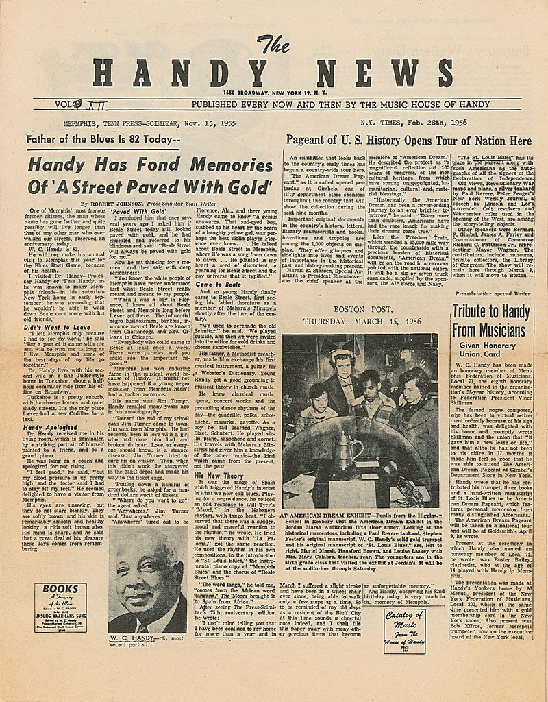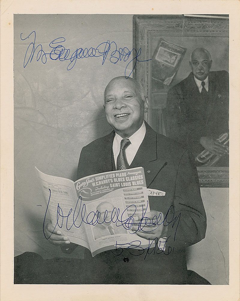 Vintage semi-glossy 8 x 10 cardstock photo of Handy thumbing through some of his sheet music, signed and inscribed in blue ballpoint, “Mr. Eugene P. Booze, William C. Handy, 5-3-1956.” Light corner tip creases, mild scattered surface marks, and a few spots of foxing to the upper border, otherwise fine condition. Accompanied by the original mailing envelope and an issue of ‘The Handy News.’